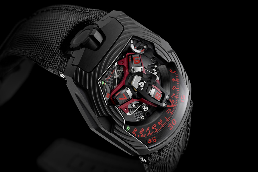 The action of the retrograde hand is too swift for the eye but you hear the sharp click that announces the arrival of the hand exactly on zero. The spectacular combination of the revolving satellite complication and retrograde minutes is seen nowhere as in the UR-210. The prominent three-dimensional minutes hand acts as a high-tech cowling that encloses the hours and carries them in turn smoothly across the scale of minutes.