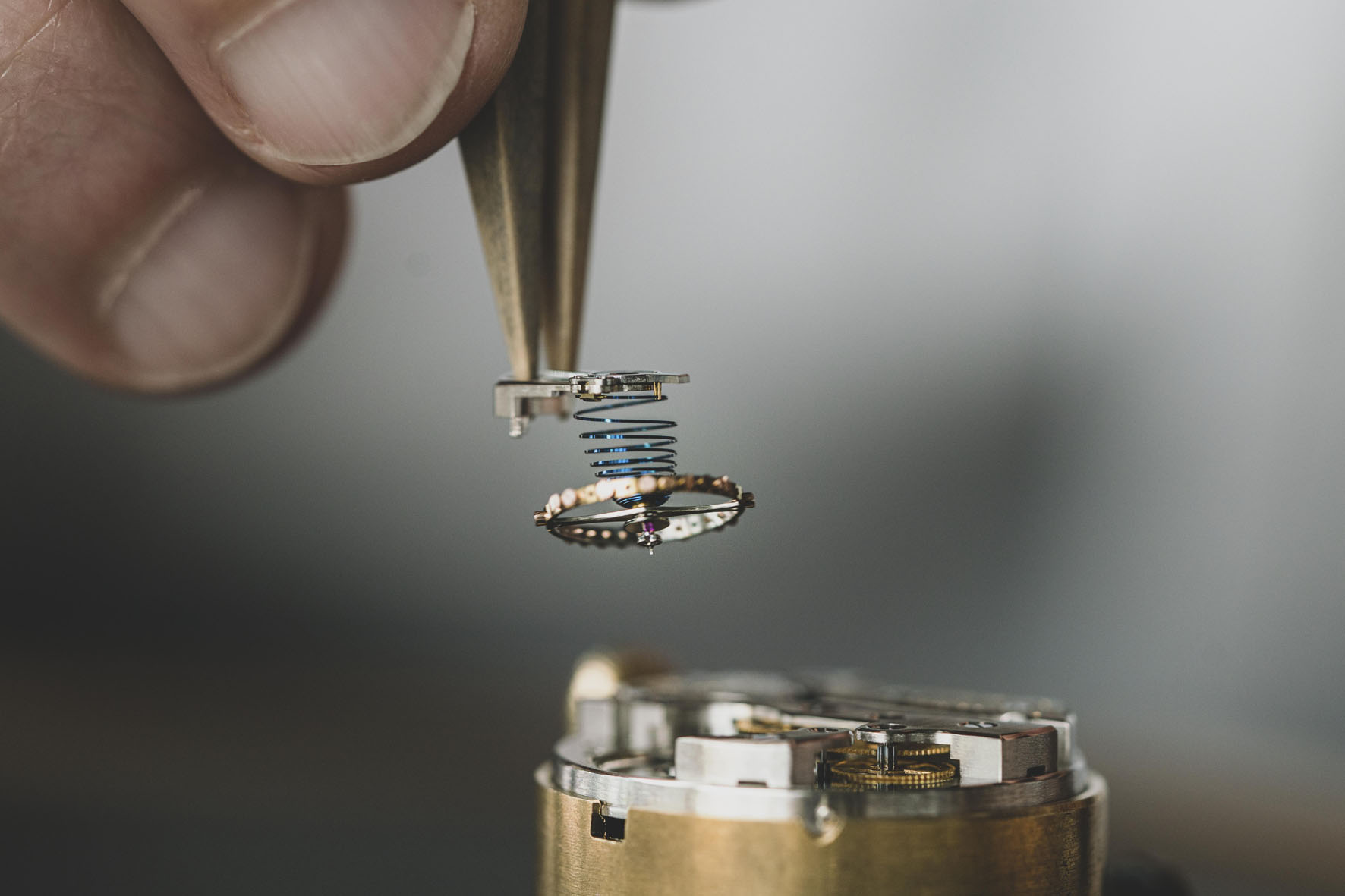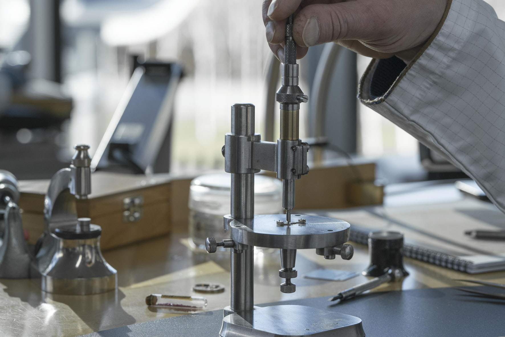 At this stage, the archive documents safeguarded by the Heritage department proved extremely valuable, notably in recreating the bridges and the mainplate according to the specificities of this vintage movement. How could each component be adjusted and calibrated prior to assembly? How should the vintage machines be regulated? How could the jewels be set on the movement, whereas they are now generally driven in? How could the exact colour of the gilding on the wheels be achieved? At what distance and at which height should they be placed in order to be faithful to the original calibre? These were all issues that the watchmakers had to resolve by assembling the components one by one, as any potential error could jeopardise the entire project.