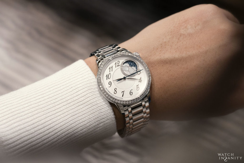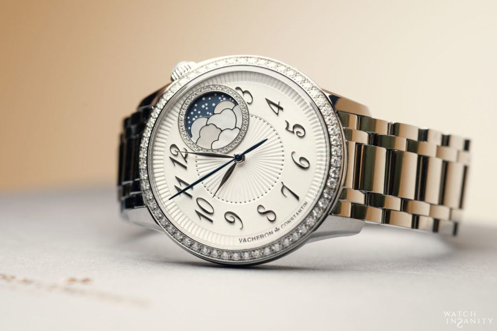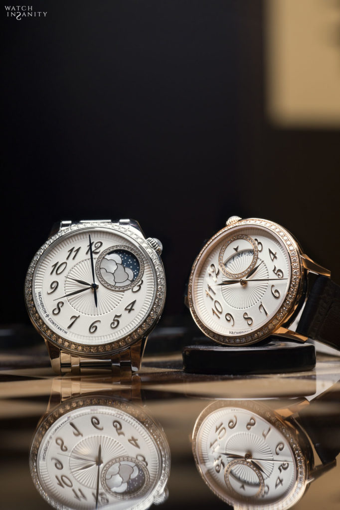Vacheron Constantin Égérie collection has five references: two self-winding with date (steel or pink-gold case), two self-winding with moon phases (steel or pink-gold case) and a very precious one with moon phase and diamond-paved.