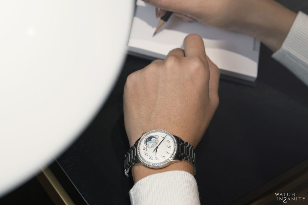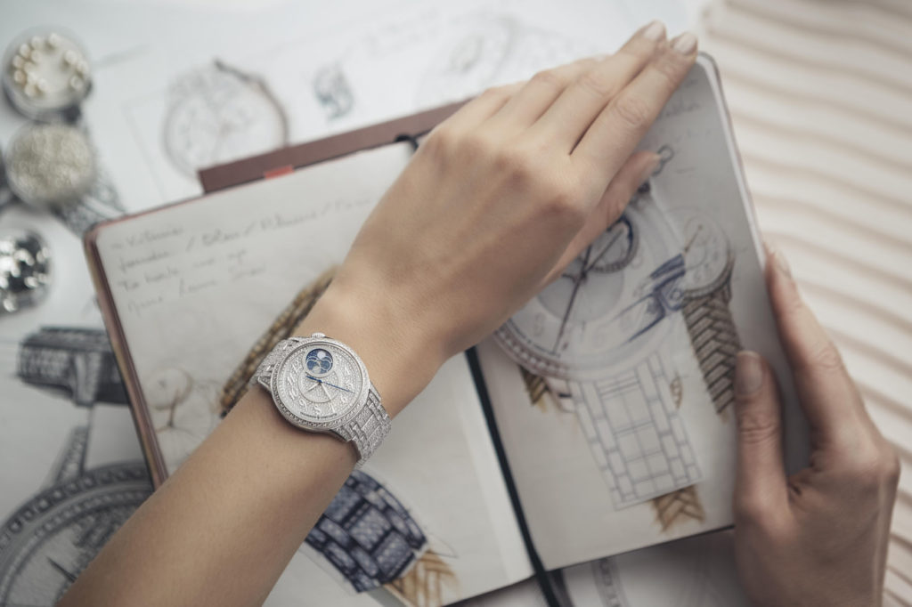 The Égérie Moon Phase has a 37mm case and the off-center dial displays the moon phases, framed by a circle in pink or white gold decorated with 36 diamonds. In this model, the moon phases craft deserves to be noted: the satellite, made of white gold on a delicate starry sky, emerges from a curtain of mother-of-pearl clouds. Here too, the movement is the in-house 1088 L caliber with a 40-hour power reserve, decorated with the same grace as that of the self-winding.