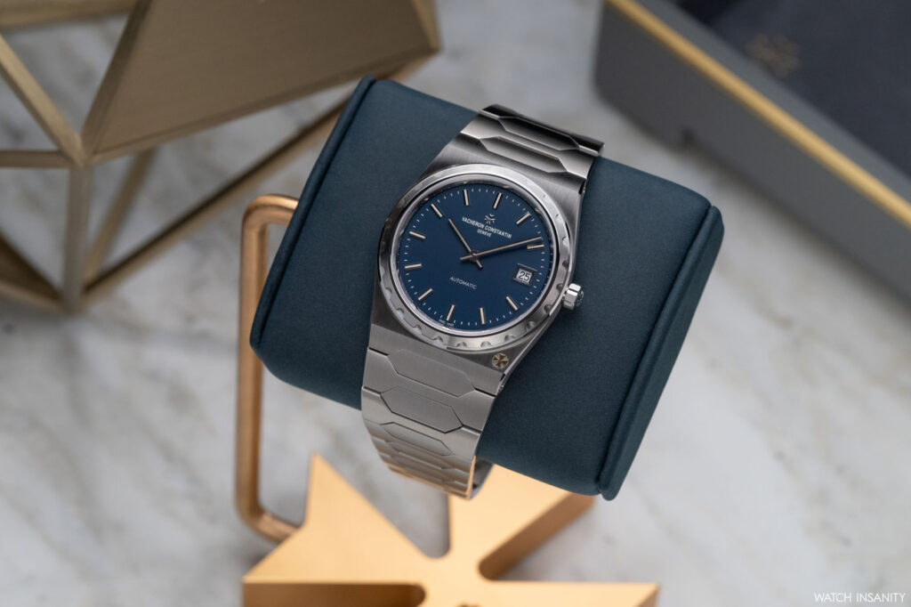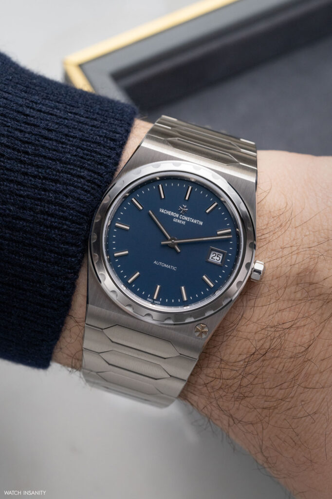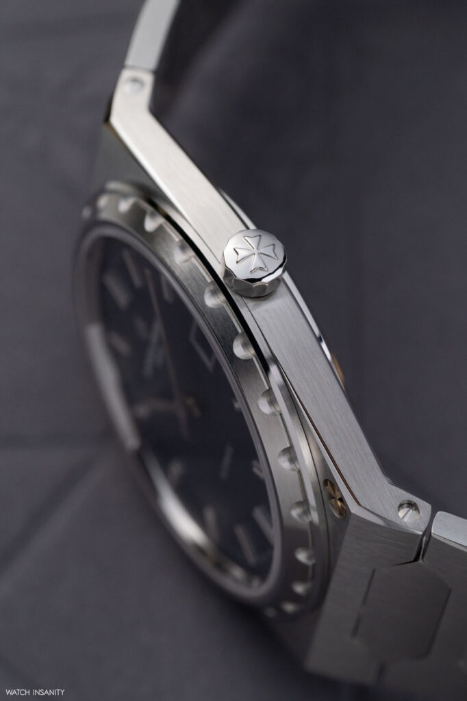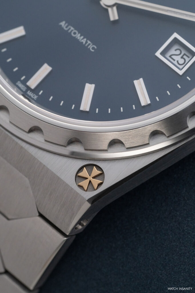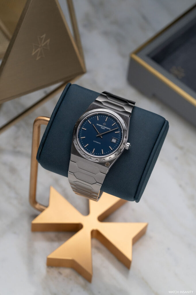 As for the common features, we have the same 37 mm diameter, fluted bezel, the integrated, tapered bracelet, and the matt gold dial. On the latter there are ‘philological’ details such as the word ‘Automatic’ at 6 o’clock – written in the typeface of the time – and the Maltese Cross, Vacheron Constantin’s symbol, engraved in the bottom right corner of the case. The current champagne colour has a slightly lighter tone than its predecessor, to the benefit of legibility.