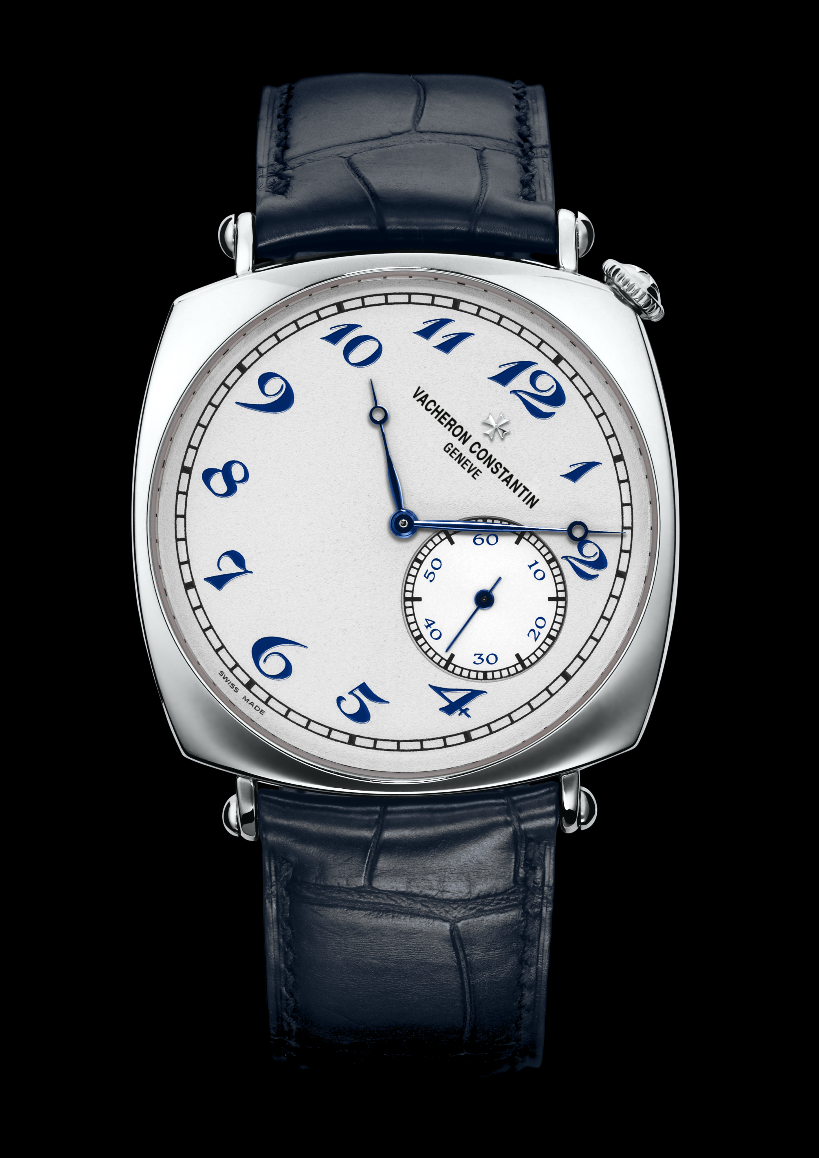Crafted in precious platinum, the Historiques American 1921 is inspired by an original cushion-shaped model with a crown placed between 1 and 2 o’clock, created by Vacheron Constantin in the 1920s for the American market. Combining the daring style characterising the era of its birth, this contemporary reinterpretation remains loyal to the original version through an imposing cambered case diagonal time read-off, offset ball-shaped crown and small seconds between 4 and 5 o’clock. The classic yet original finely grained silvered dial bears 12 blue painted Arabic numerals and a black railway-type minute track, swept over by blued Breguet-type hands. Fitted with a lightly domed crystal, the 40 mm-diameter case water- resistant to 30 metres houses Vacheron Constantin manual-winding Caliber 4400 AS. This movement adorned with particularly finely hand-crafted finishing and endowed with a comfortable 65-hour autonomy drives hours, minutes and small seconds indications. The restrained and timeless elegance of this ‘dandy chic’ watch is complemented by a dark blue alligator leather strap fitted with a platinum buckle.