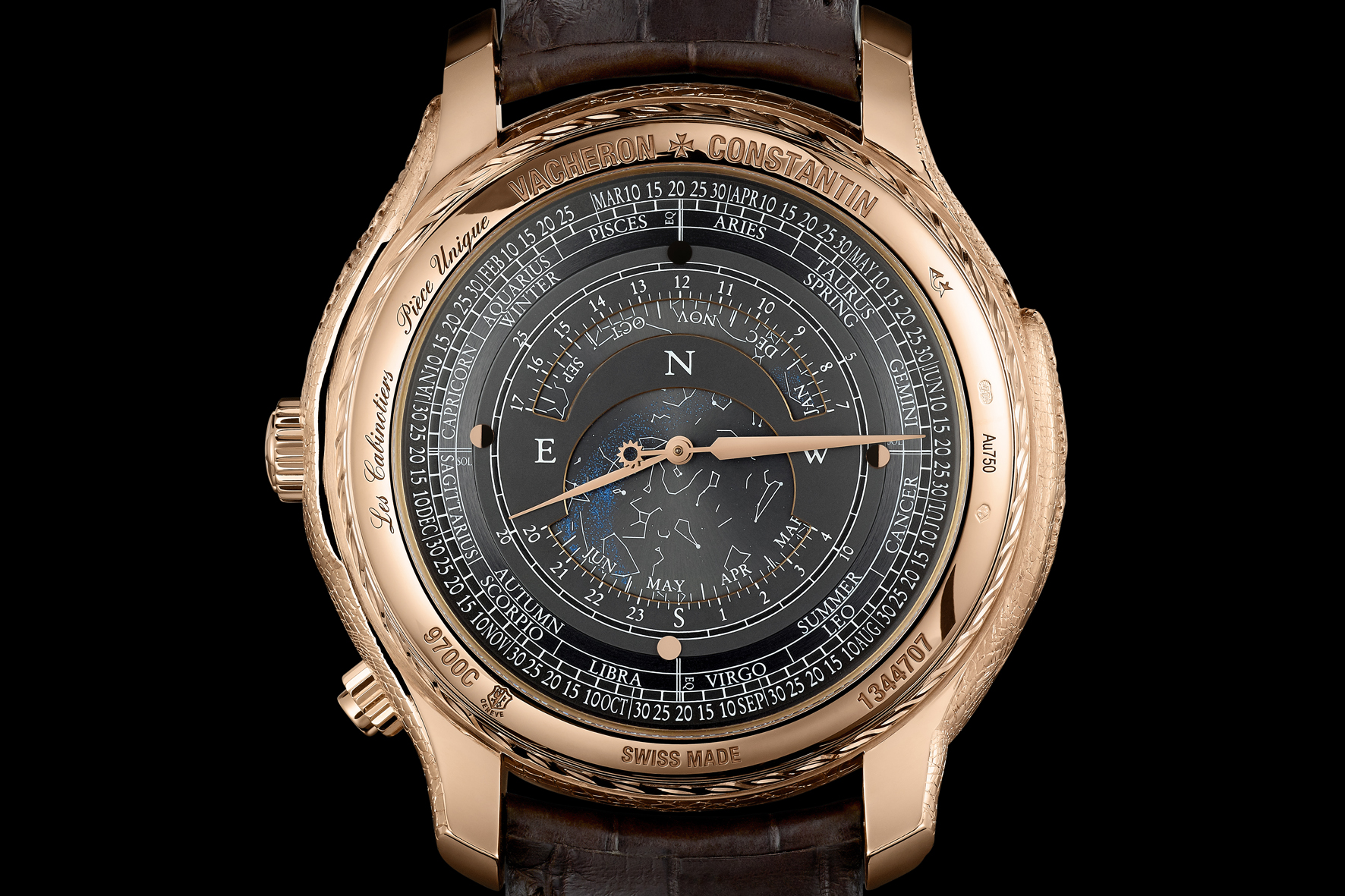 On the back of the watch, the second dial is also graced with a wealth of functions, arranged on two levels. The central disc bears a sky chart as well as the four cardinal points. Two North and South openings reveal the month of the year and sidereal hours, corresponding to “true” time. A small hand running around the rim shows the age of the moon, meaning the number of days since the last full moon; while a long slender hand featuring a counterweight adorned with a tiny sun indicates the date as well as the zodiac sign, the season and the corresponding equinox or solstice.