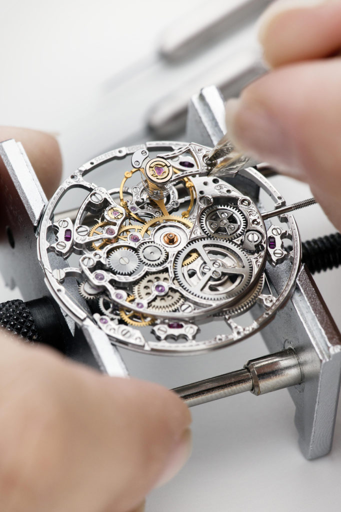 In addition to the skeleton technique, which consists of finely openworking a mechanical movement by hollowing out its components yet without compromising their reliability, Vacheron Constantin decorated the movement with special finishing work, entirely performed by hand. Multiple skills have thus come into play so as to endow the mechanism with the sought-after aesthetic perfection. Straight-graining the surfaces to give them a satin-brushed finish; bevelling straight lines and curves to make the create light effects; circular brushing, sunburst finishing, circular-graining and polishing to ensure varied reliefs: while the use of all these ancestral craftsmanship techniques has served to highlight the beauty of the components, an anthracite grey shade obtained by means of an NAC electrolytic treatment gives the mechanism a very modern face.