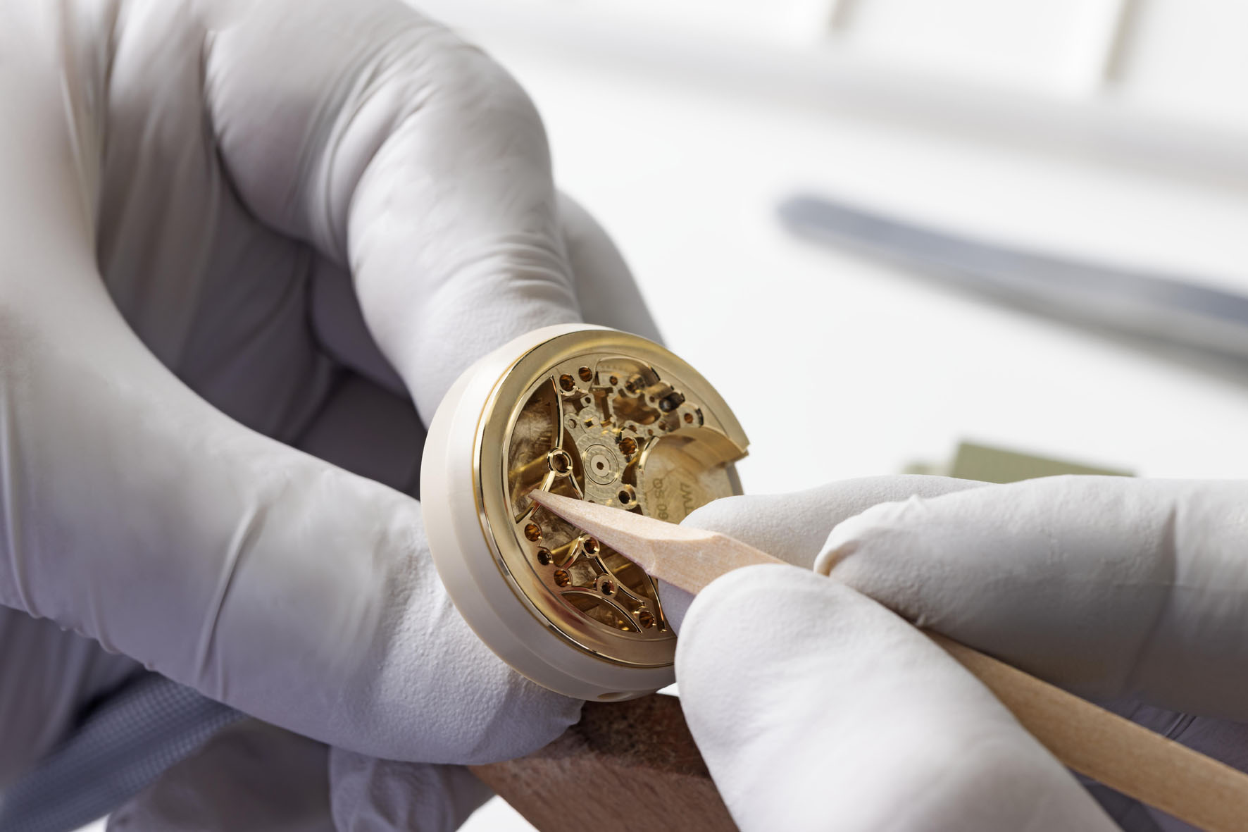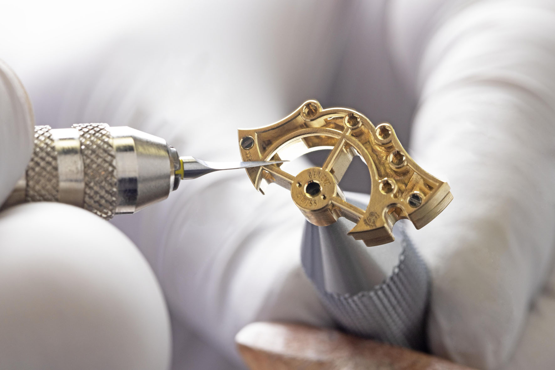This thinness is notably due to the choice of a peripheral gold oscillating weight, which also enables a completely clear view of the rear of the movement. The work done on the baseplate and the four bridges can be clearly admired, with the NAC surface treatment applied by electrolysis conferring an anthracite grey tint. This contemporary touch given to the movement blends perfectly with the classic haute horlogerie finishes in the form of hand-drawn flanks and hand-chamfering with polished bevels to accentuate the light playing across the components. The mainplate and bridges are also delicately decorated to create a finish of very fine, perfectly horizontal grooves. Such concern for details is a credo which holds that even the smallest part deserves the same meticulous attention as those that are perfectly visible.