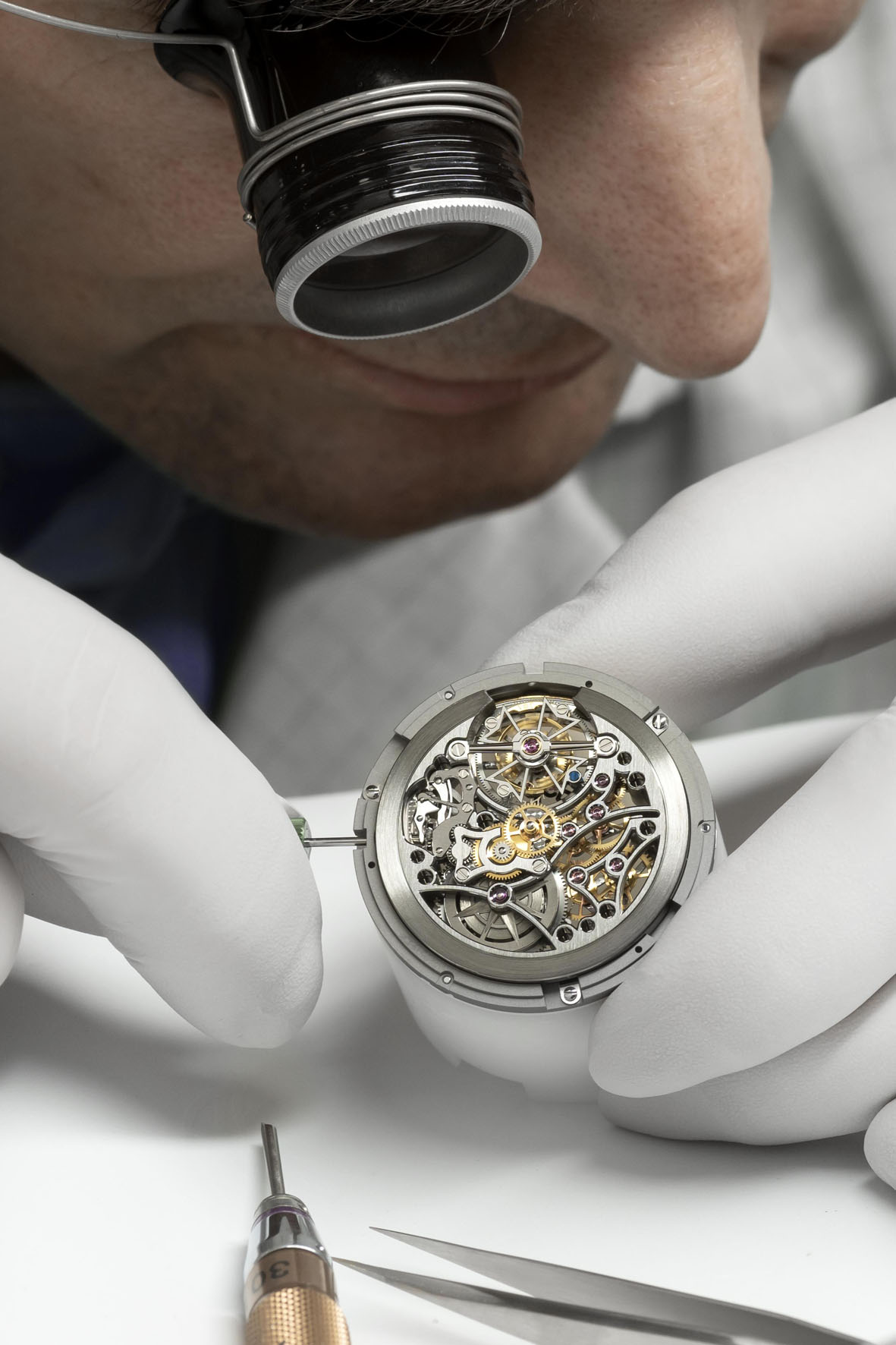 The sapphire crystal serving as the dial reveals all the details of the calibre, like a horological anatomy taking shape with each component. The hour-markers secured to this crystal are in rhodium-plated 18K 5N pink gold or 18K white gold, depending on the model. The same noble metals are used for the hands which, like the hour-markers, are coated with Super-LumiNova ensuring perfect night-time visibility. The dial ring is available in black lacquered 18K 5N pink gold or in blue PVD-treated 18K white gold.