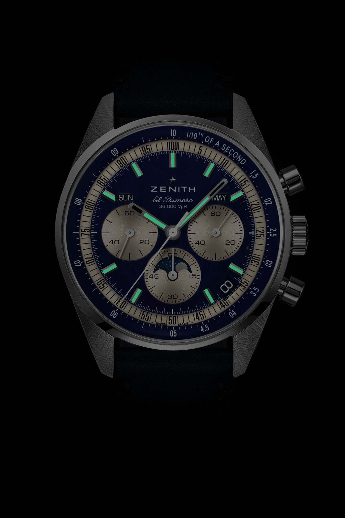At its heart beats the automatic El Primero 3610 calibre, a modern evolution of ZENITH’s iconic high-frequency chronograph, now enhanced with a true 1/10th of a second function. The chronograph seconds hand completes a full rotation of the dial in just 10 seconds, precisely indicating 1/10th of a second on the silver-toned chapter ring. With a 60-hour power reserve and a stop-seconds mechanism for precise time-setting, this movement is a perfect blend of heritage and innovation.