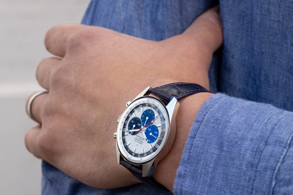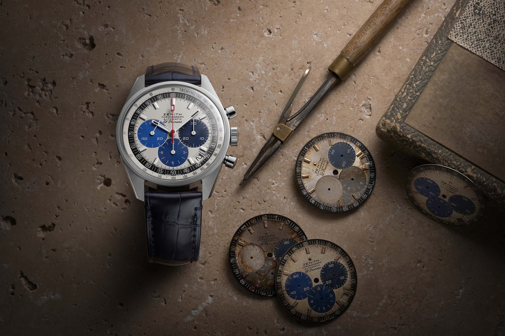 There in the attic, among the countless artifacts and pristinely preserved tools that the heroic Charles Vermot had hidden away in the 1970s during the quartz crisis, a small unlabeled box was uncovered. In it, remarkably preserved after decades, were a number of dials: The signature El Primero tri-color dial of the A386 that became a design icon, and more remarkably, another version of the tri-color dials, using three different shades of blue. No records exist of these presumably prototype blue tri-color dials, but considering that they were kept with prototype dials of the A386 in the same configuration it was commercialized in 1969, one can assume that is was part of the original prototype dials for the A386, and that Charles Vermot hid them in the attic along with all the other El Primero tools. We may never know if the dial with three shades of blue was intended as an alternative to the A386’s dial or intended for a different model, but its striking beauty and intriguing history compelled the watchmakers at Zenith to finally put it into production.