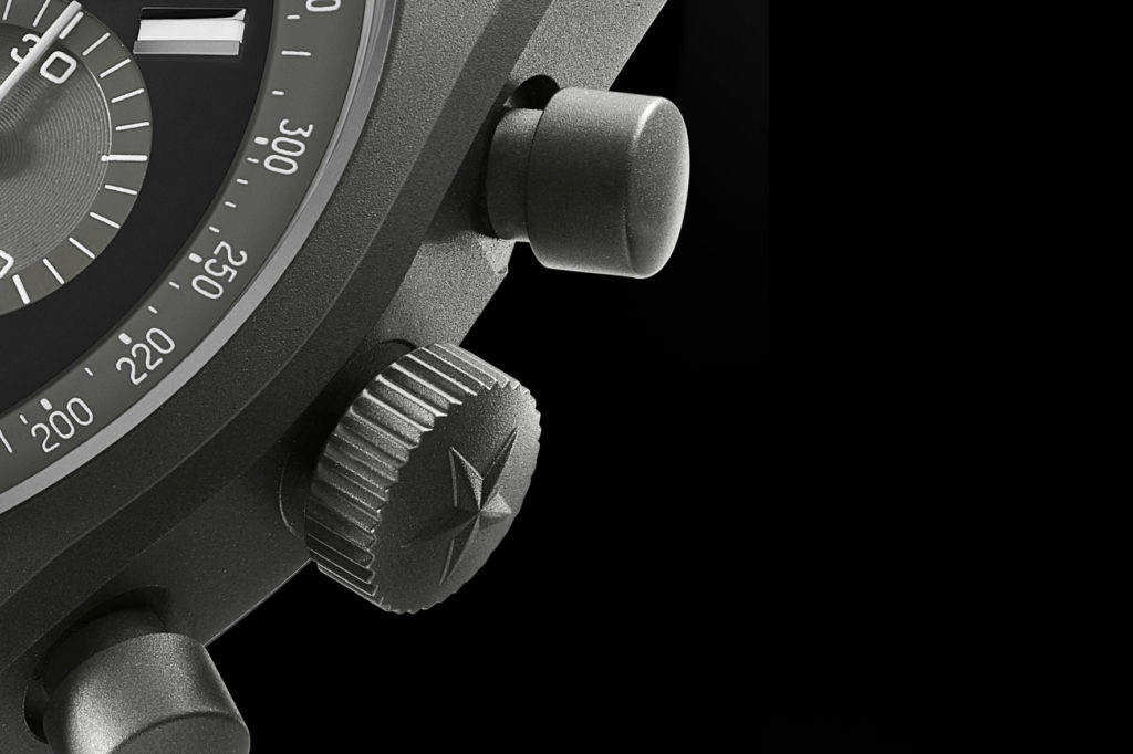 In spite of its dark demeanor, the Shadow remains a highly legible chronograph, with grey counters and tachymeter scale subtly contrasting against the deep, matte black dial. The hands and applied markers are filled with white SuperLuminova that emits a bright green glow in the dark. The black rubber strap with a cordura-effect features a touch of white on the stitching, fixed to a microblasted titanium pin buckle. (Price € 8.300)