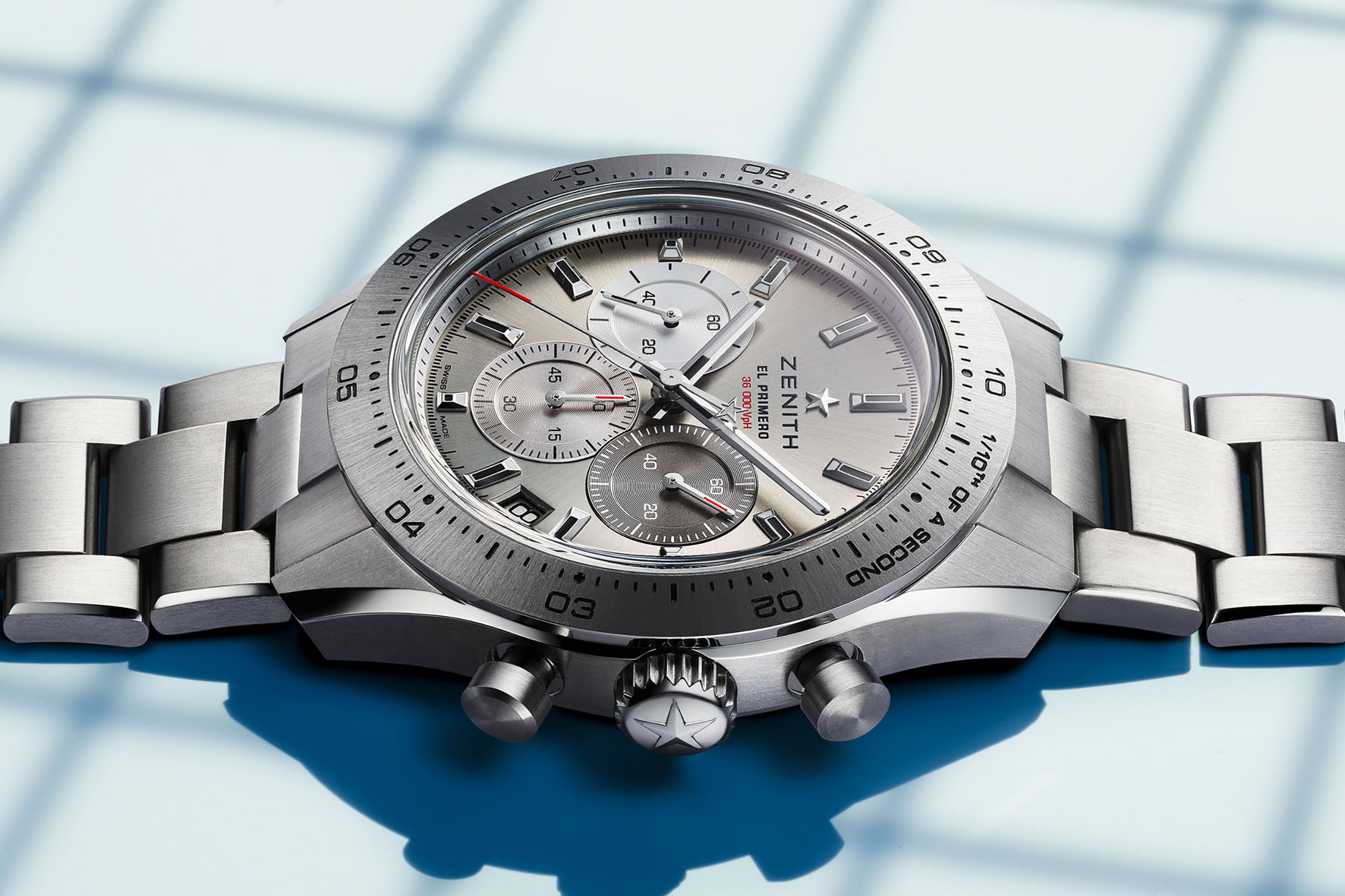 Keeping with the case’s muted chromatics, the Chronomaster Sport Titanium’s dial reinterprets ZENITH’s signature tricolour design in shades of grey. The sunray-patterned dialis done in a galvanic nickel-greycolour,features chronograph counters in three different tones of anthracite, grey and silver. The three-link bracelet is also with an adjustable clasp is also made in vertically satin-brushed titanium. A tangible difference can immediately be felt when wearing the Chronomaster Sport Titanium, which weighs30% less than its steel equivalent.