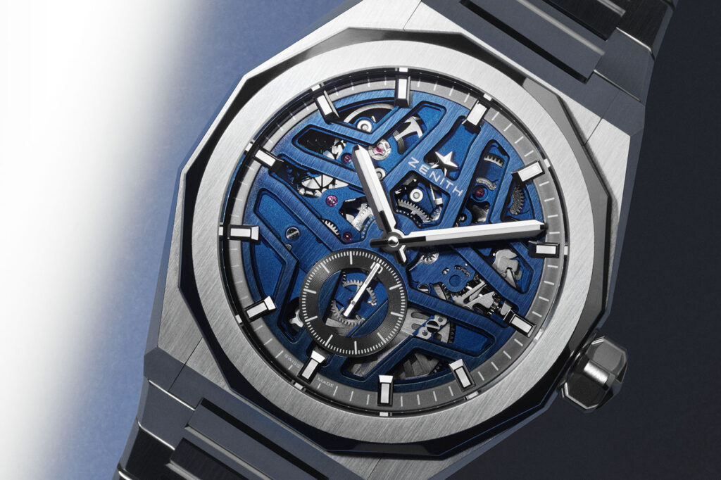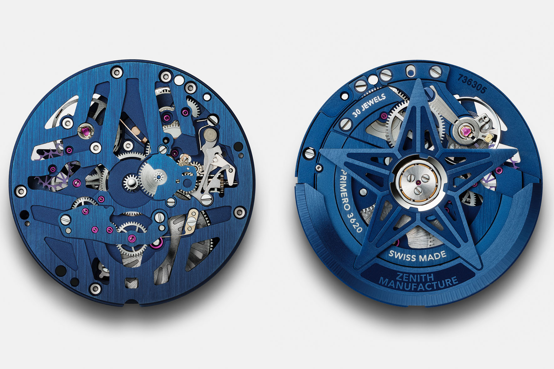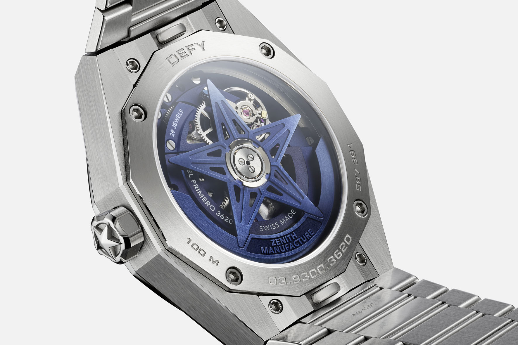 The open dial takes on the form of a four- pointed stars, in a nod to the ZENITH “double Z” logo of the 1960s. The chapter ring’s applied baton hour markers as well as the central hour and minute hands are filled with Super-LumiNova for easy legibility; something that is usually sacrificed in skeleton watches. A constantly running 1/10th of a second counter at 6 o’clock makes steady jumps in fixed increments, completing one revolution every 10 seconds, a feature that’s unique in watchmaking to the new generation of the El Primero automatic high-frequency calibre. The open dial comes in black or blue, with the skeleton movement finished in the same colour as the open dials for a cohesive and architectural look.