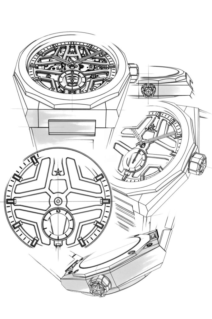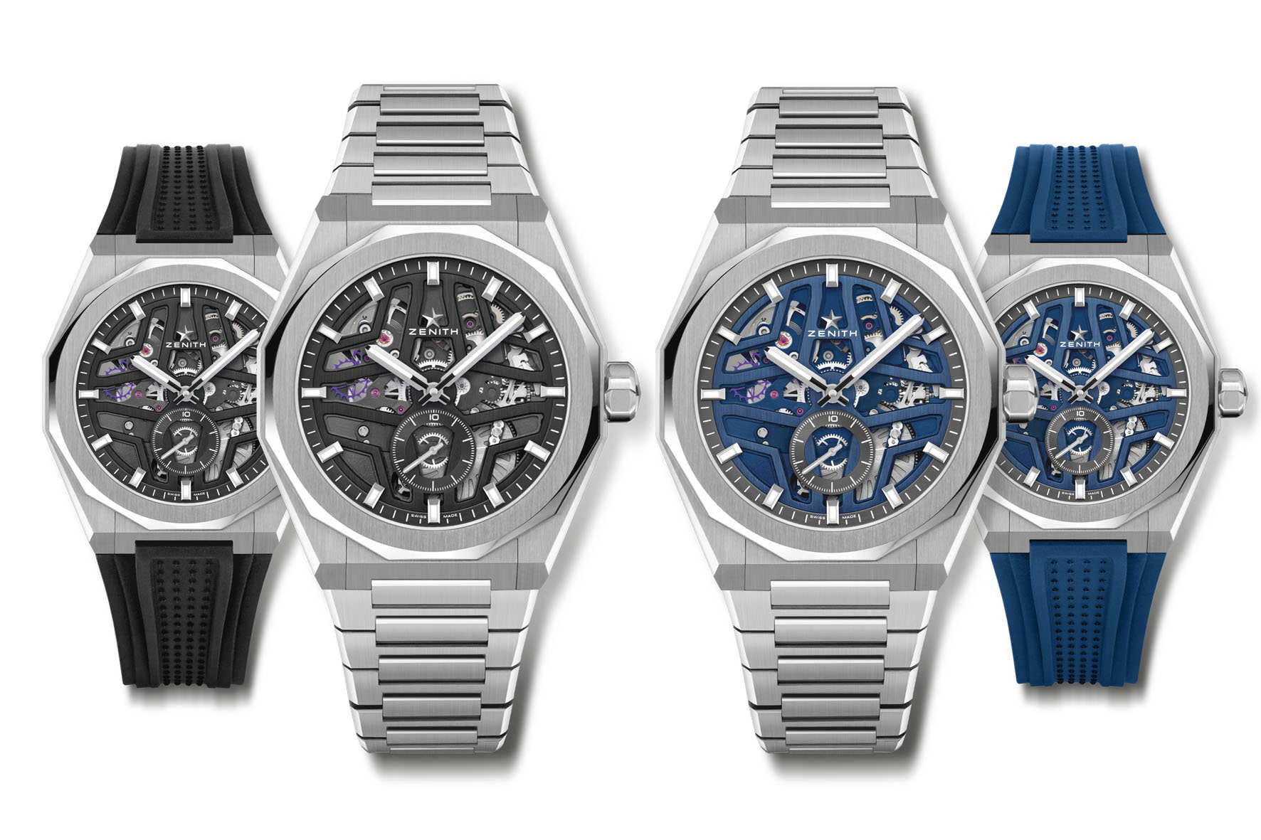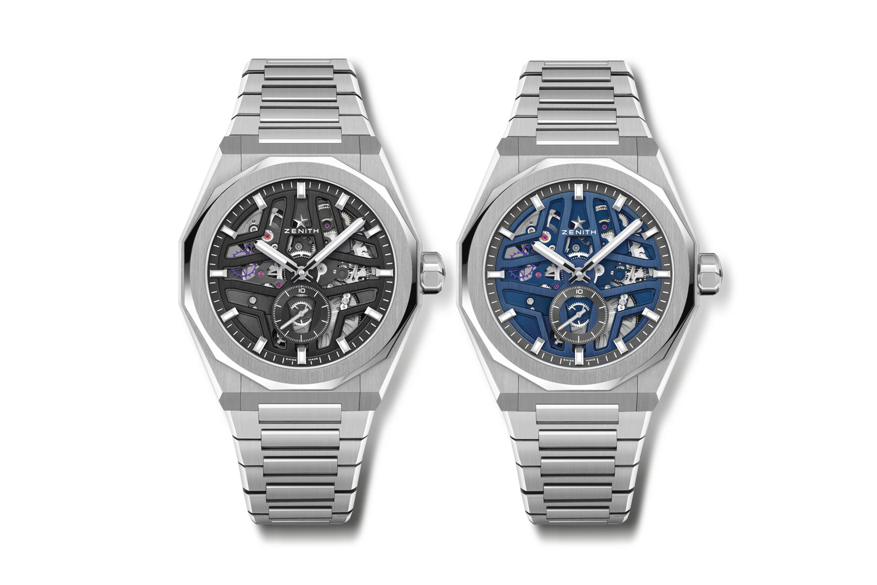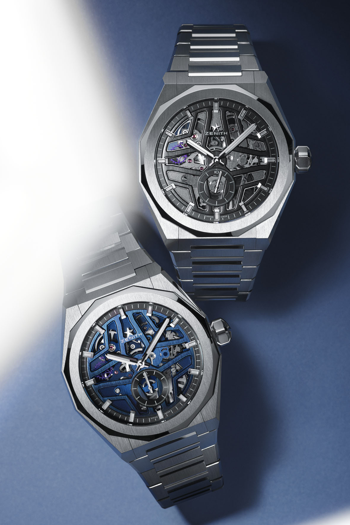 The open dial takes on the form of a four- pointed stars, in a nod to the ZENITH “double Z” logo of the 1960s. The chapter ring’s applied baton hour markers as well as the central hour and minute hands are filled with Super-LumiNova for easy legibility; something that is usually sacrificed in skeleton watches. A constantly running 1/10th of a second counter at 6 o’clock makes steady jumps in fixed increments, completing one revolution every 10 seconds, a feature that’s unique in watchmaking to the new generation of the El Primero automatic high-frequency calibre. The open dial comes in black or blue, with the skeleton movement finished in the same colour as the open dials for a cohesive and architectural look.