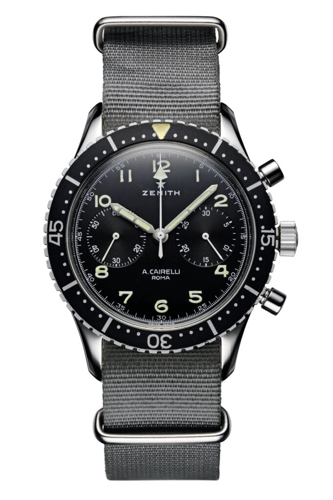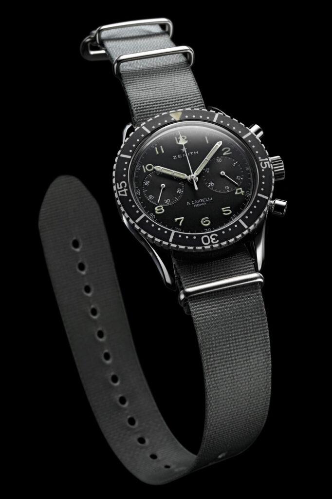 In the history that ties Zenith to flight there is also another famous reference, the so-called A. Cairelli “Tipo CP-2” chronograph. In the early 1960s Zenith provided these pilot chronographs to A. Cairelli, a Rome-based dealer who supplied the Italian Army, mostly with Zenith and Universal Genève watches.