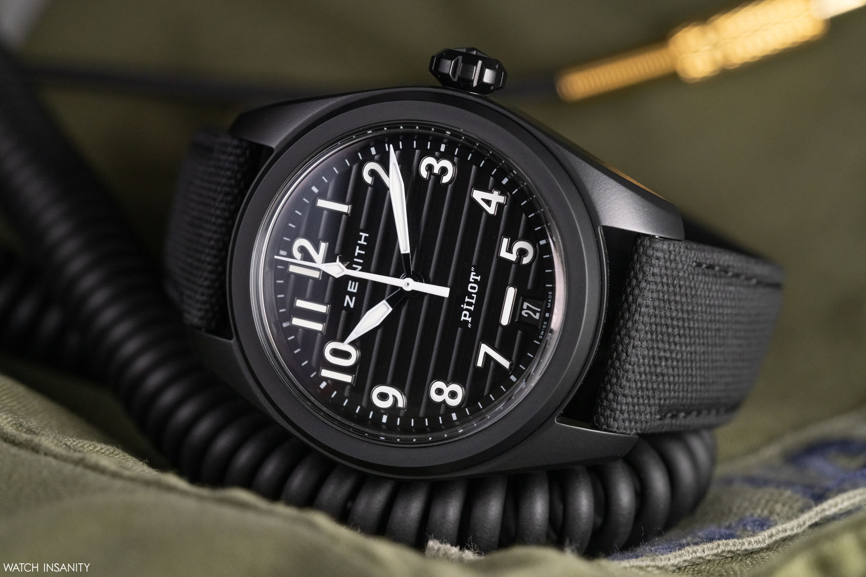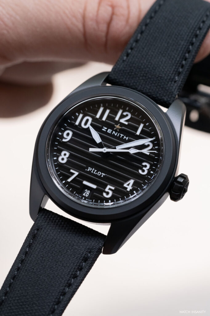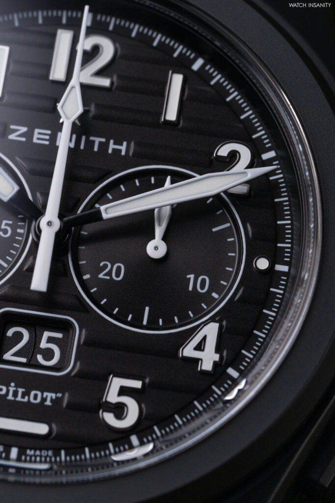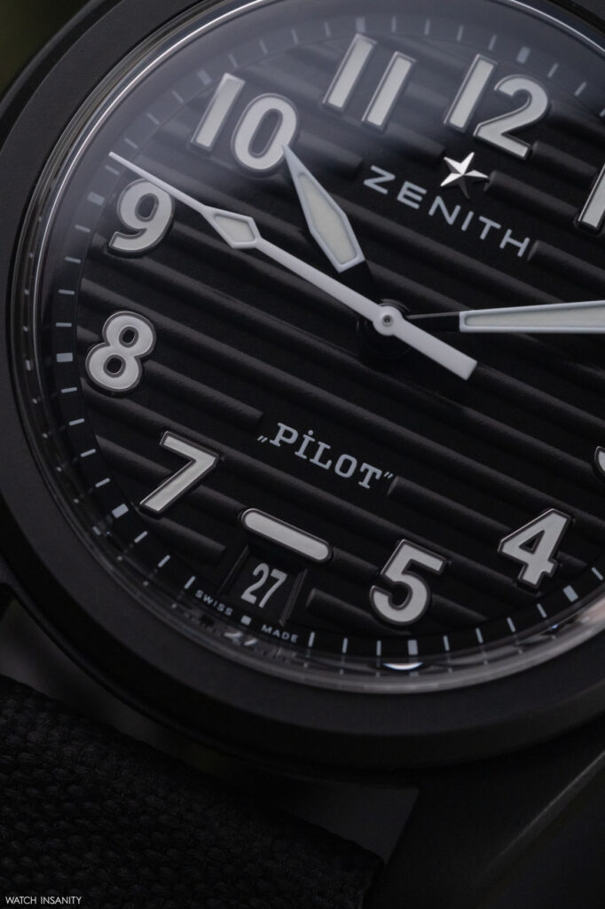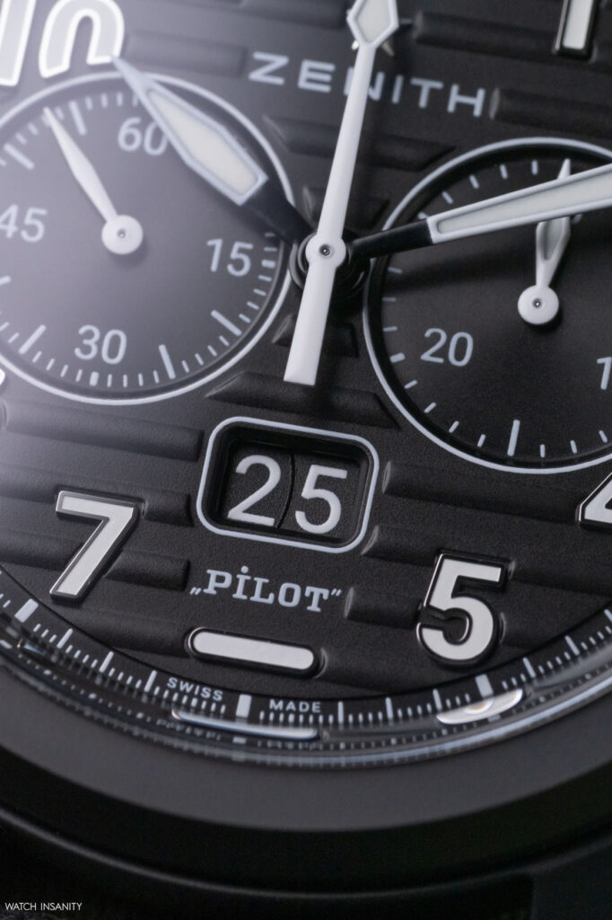 The date window is a 6 o’clock, with white numbers on a black background. It is topped by a horizontal index which should recall the artificial horizon instrument aboard aircrafts. In this sense, it should allow the wearer to understand their orientation even in the dark, helping them to read the time without hesitation. Immediately above it is the Pilot lettering, which counterbalances the Zenith logo and star in the upper half of the dial.