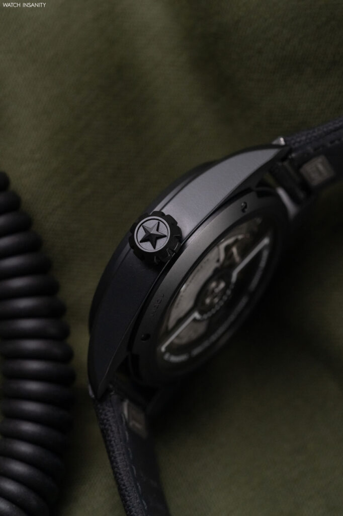 The case has a completely new design, with a round and flat bezel fixed on top. On the steel version, the surfaces are vertically satin-brushed and the rounded parts are shiny, the black ceramic case is entirely micro-blasted with a matte finish. While the case of the Type 20 was completely circular with wire lugs, this one is more modern, thanks to the flat bezel and the wide, more wearable lugs, which help fit thanks to a lug-to-lug of 49.6 mm and a thickness of 12.9.