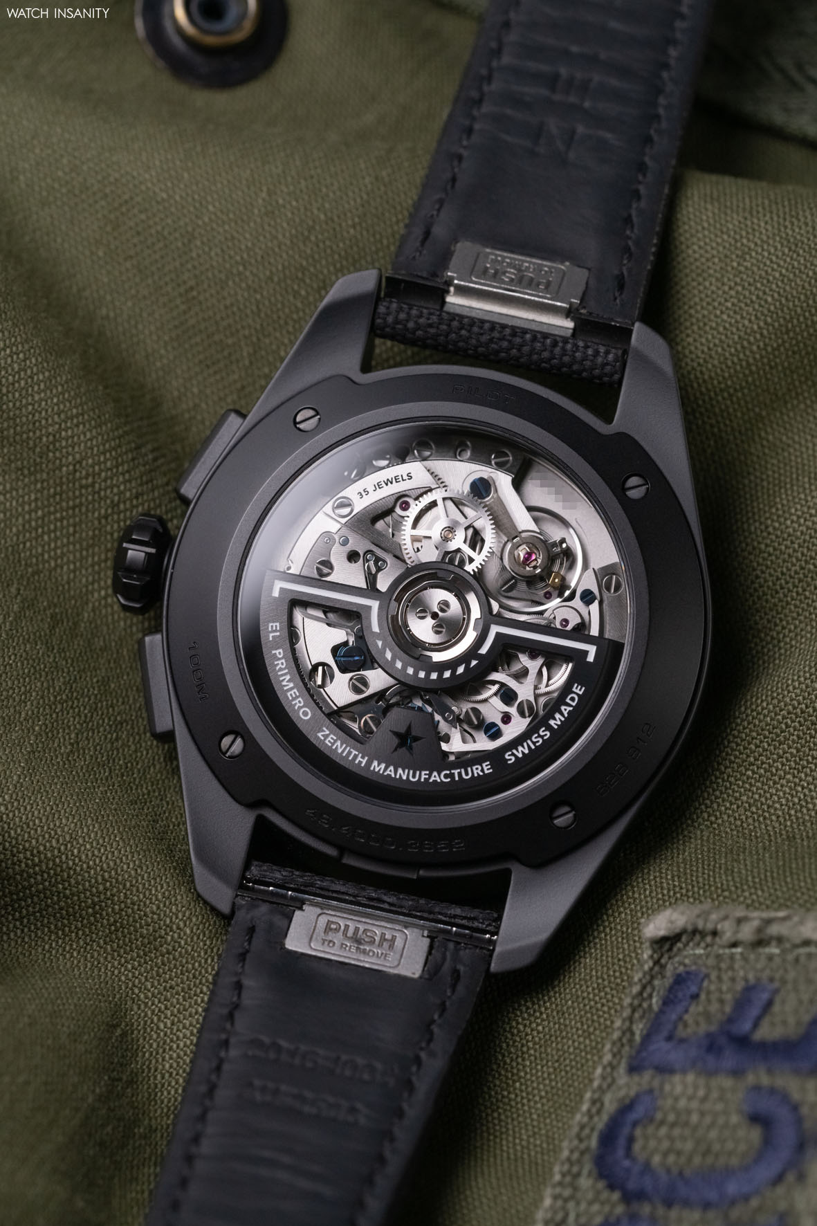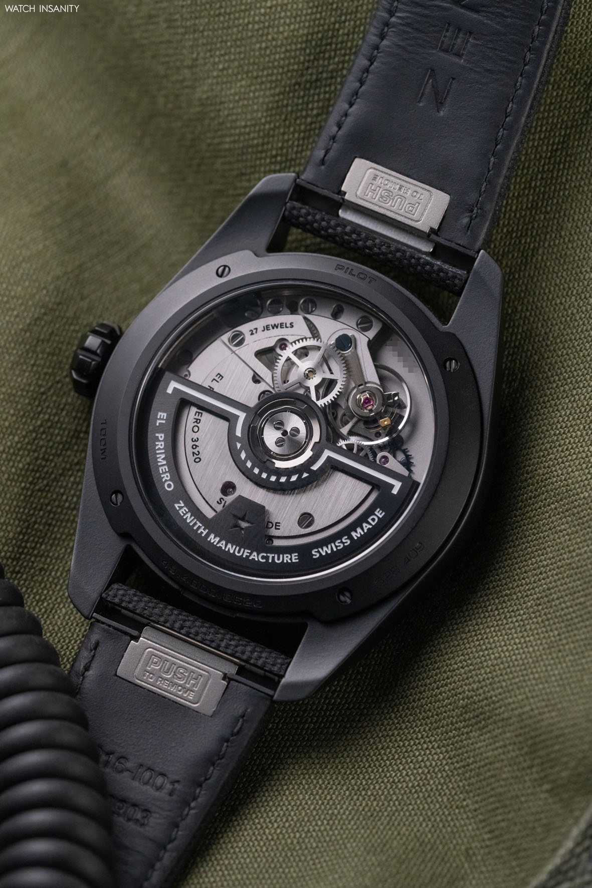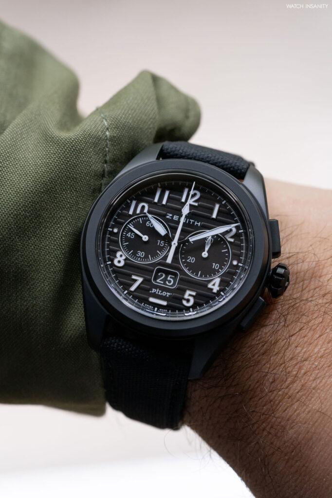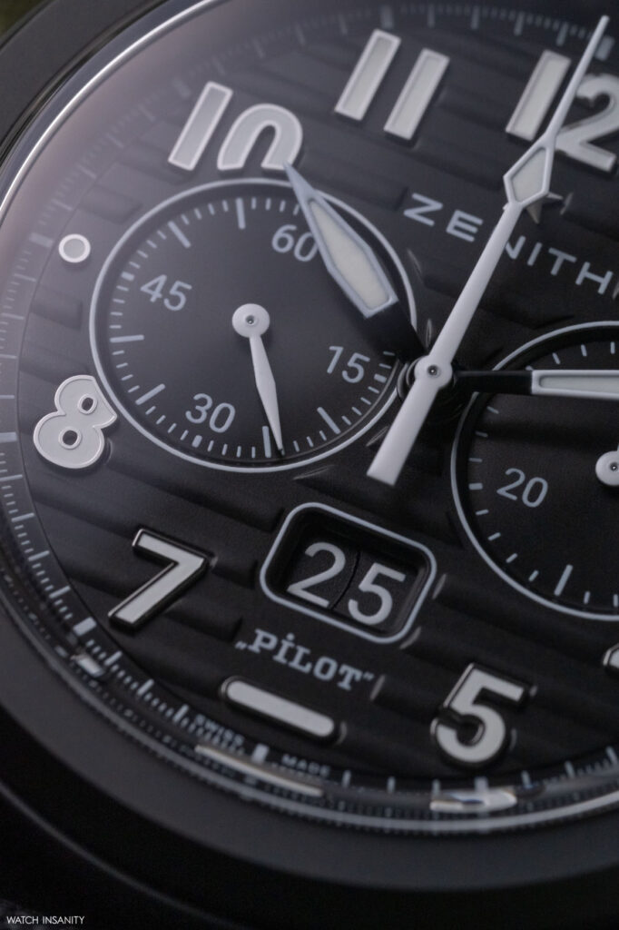 The Zenith Pilot Automatic is powered by the in-house El Primero 3620 automatic caliber, the same which powers the Defy Skyline. Unlike the latter, on the Pilot there is no small tenth-of-a-second counter while there is the classic central seconds hand. Like all El Primero movements, it oscillates at 36,000 vibrations/hour, with a 60-hour power reserve.