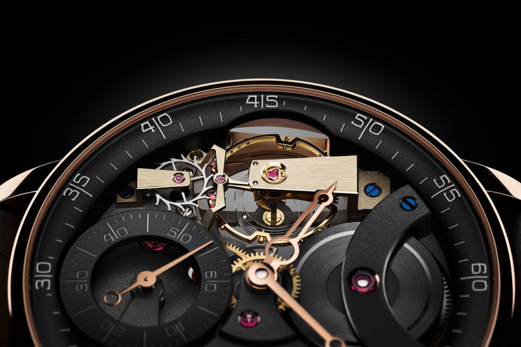 L’indicazione dell’ora è ridotta alla sua espressione più pura: un réhaut periferico per l’ora e i minuti, con i piccoli secondi a ore 6. A ore 2, l’indicatore della riserva di carica è inciso all’interno di un settore graduato a segmenti di 12 ore che vanno da “0” a “1”. Il resto del quadrante, volutamente lasciato aperto, permette di apprezzare l’estetica dei componenti del movimento, la loro disposizione, nonché le finiture che alternano spigoli smussati e lucidi e superfici rese opache dalla sabbiatura fine. Il movimento è complesso nonostante la sua apparenza minimalista. Il réhaut dell’ora e dei minuti, costruito sul modello di un anfiteatro, si prolunga verticalmente fino alla platina. Il disco dei secondi, traforato e sospeso, è fissato dal basso a un ponte dedicato. Il ponte del bilanciere, con la sua particolare forma a tallone avvitato, è un riferimento storico all’orologio astronomico N°3 di Ferdinand Berthoud. Il ponte del bariletto posto a mezzogiorno, che disegna un ampio semicerchio di 120 gradi, ricorda l’aspetto di un ponte dell’orologio N°2575 con ripetizione dei quarti, realizzato da Louis Berthoud.