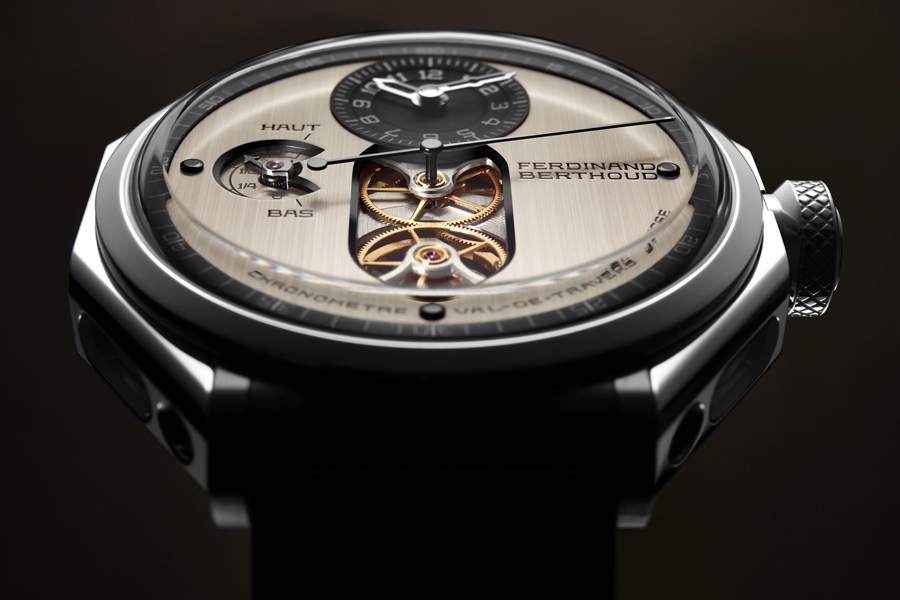 Una finestra nel quadrante svela la ruota che trascina la gabbia del tourbillon e la ruota dei secondi su cui è ancorata la lancetta dei secondi centrale, un’architettura inedita in un tourbillon. Quest’ultima, in bronzo è nera e sottile e punta il chemin de fer in zaffiro traslucido alla periferia del quadrante. Ora e minuti sono decentrati a mezzogiorno, indicati da lancette traforate in oro bianco. Sul quadrante è poi incisa la dicitura “Chronomètre Val-De-Travers Suisse”.