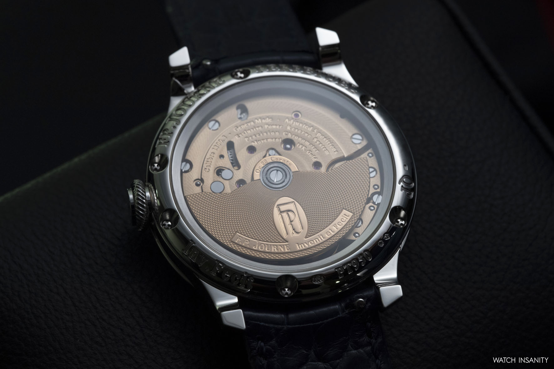 Anche le più piccole parti del calibro sono state oggetto di finiture attente da parte di F.P. Journe: le teste delle viti sono lucidate e hanno le scanalature smussate, così come sono lucidate a mano e smussate le componenti in acciaio. La ricarica automatica avviene attraverso il movimento unidirezionale del rotore, reso possibile da un sistema di cuscinetti a sfera autobloccanti.