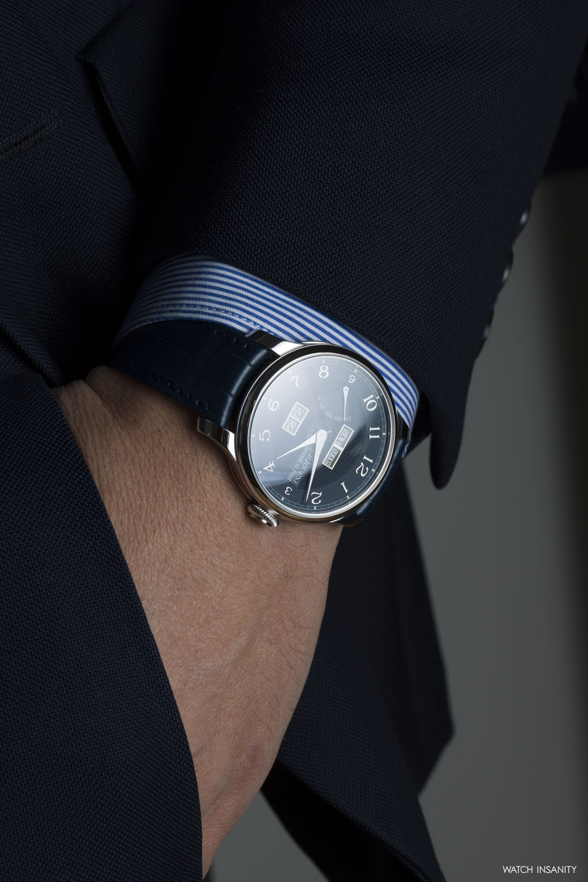 Il blu del quadrante in argento è stupefacente, esaltato dalla lavorazione a guilloché della parte centrale che contrasta con l’anello delle ore liscio e il contatore della riserva di carica lavorato a cerchi concentrici. La minuteria chemin de fer bianca richiama lo sfondo delle finestre del datario, mentre le finestre e gli indici numerici applicati in oro bianco si intonano alle lancette, in acciaio rodiato.