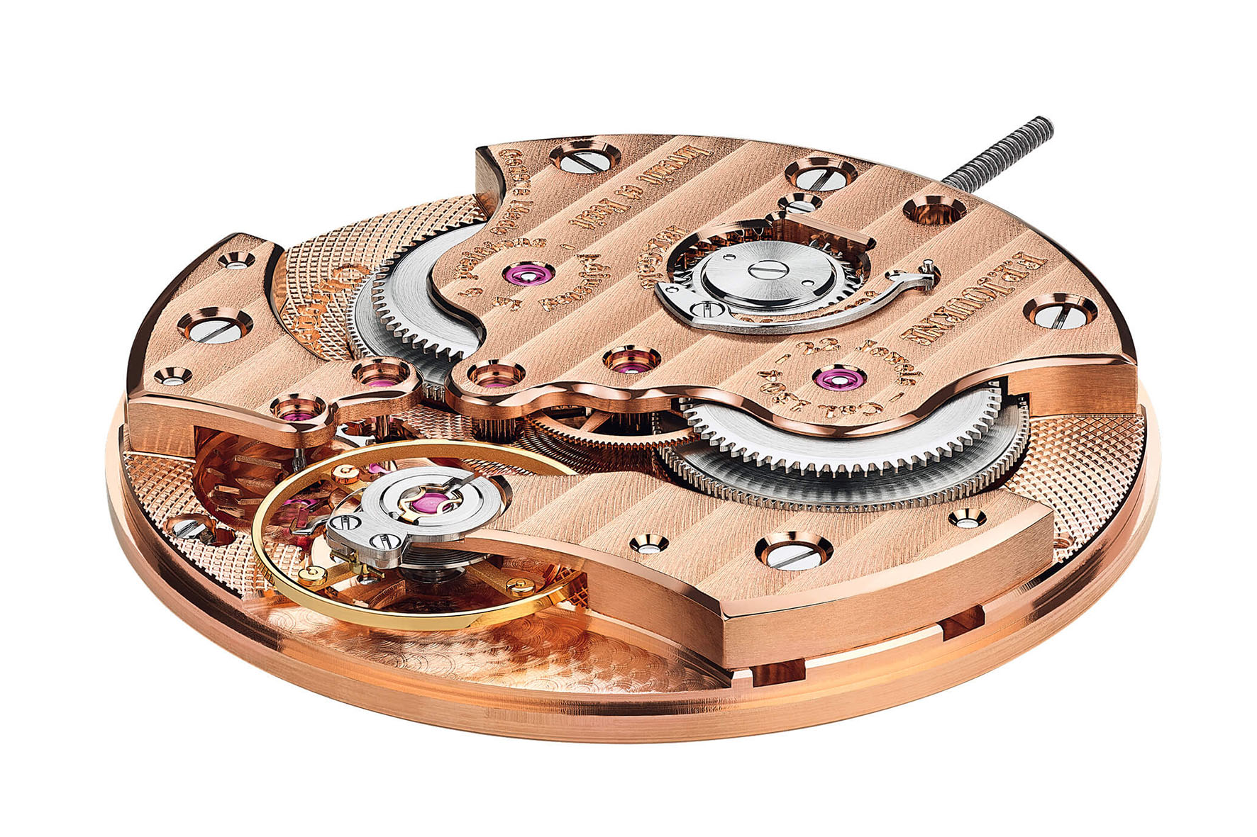 Il Calibro 1304 a carica manuale che anima gli orologi della collezione è spesso solo 4 mm ed è costruito intorno a due bariletti che lavorano in parallelo. In questo orologio, la soluzione del doppio bariletto non serve tanto a migliorare la durata della carica – circa 56 ore – ma la stabilità della coppia fornita all’organo di regolazione. Visti attraverso il fondello trasparente, il bilanciere e lo scappamento sembrano staccati e pare che scandiscano il tempo senza alcuna forza motrice apparente. Parte del treno del tempo è posizionata sotto il quadrante, con solo la ruota centrale visibile: in questo modo, il bilanciere sembra ancora più isolato, quasi sospeso nel vuoto.