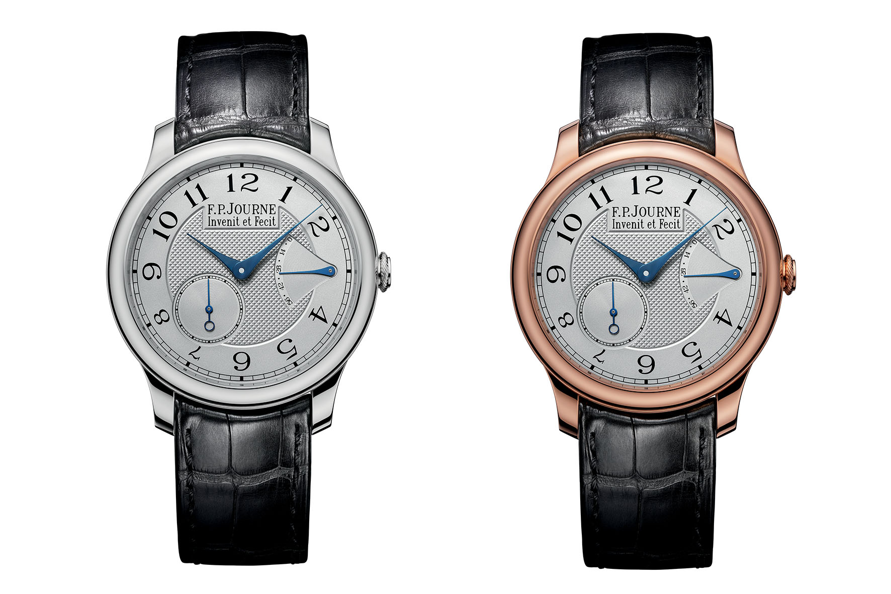 Durante i suoi 20 anni di vita, il Chronomètre Souverain è stato declinato da F.P.Journe in molteplici varianti, con la costante della cassa da 40 mm in oro rosso 6N 18K o in platino, e del calibro manuale 1304 (ma è stato disponibile anche in 38 mm). Per festeggiare la ricorrenza, la manifattura ginevrina ha presentato quest’anno una versione dell’orologio con quadrante blu e indici applicati in oro 5N 18K o in oro grigio, a seconda del materiale della cassa, disponibile sia con cinturino in alligatore, sia con bracciale a cinque file in oro rosso 6N 18K o in platino. Sono referenze acquistabili solo nelle boutique e negli Espaces F.P.Journe. In entrambe le versioni di cassa, la parte centrale del quadrante in argento è lavorata a guilloché.