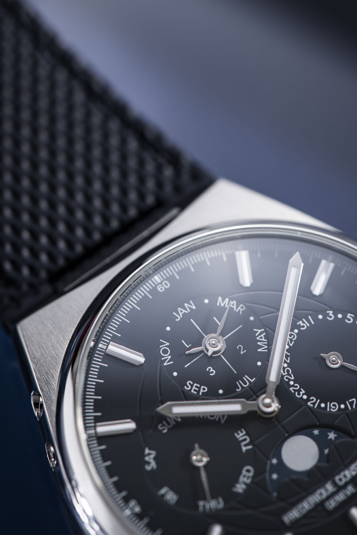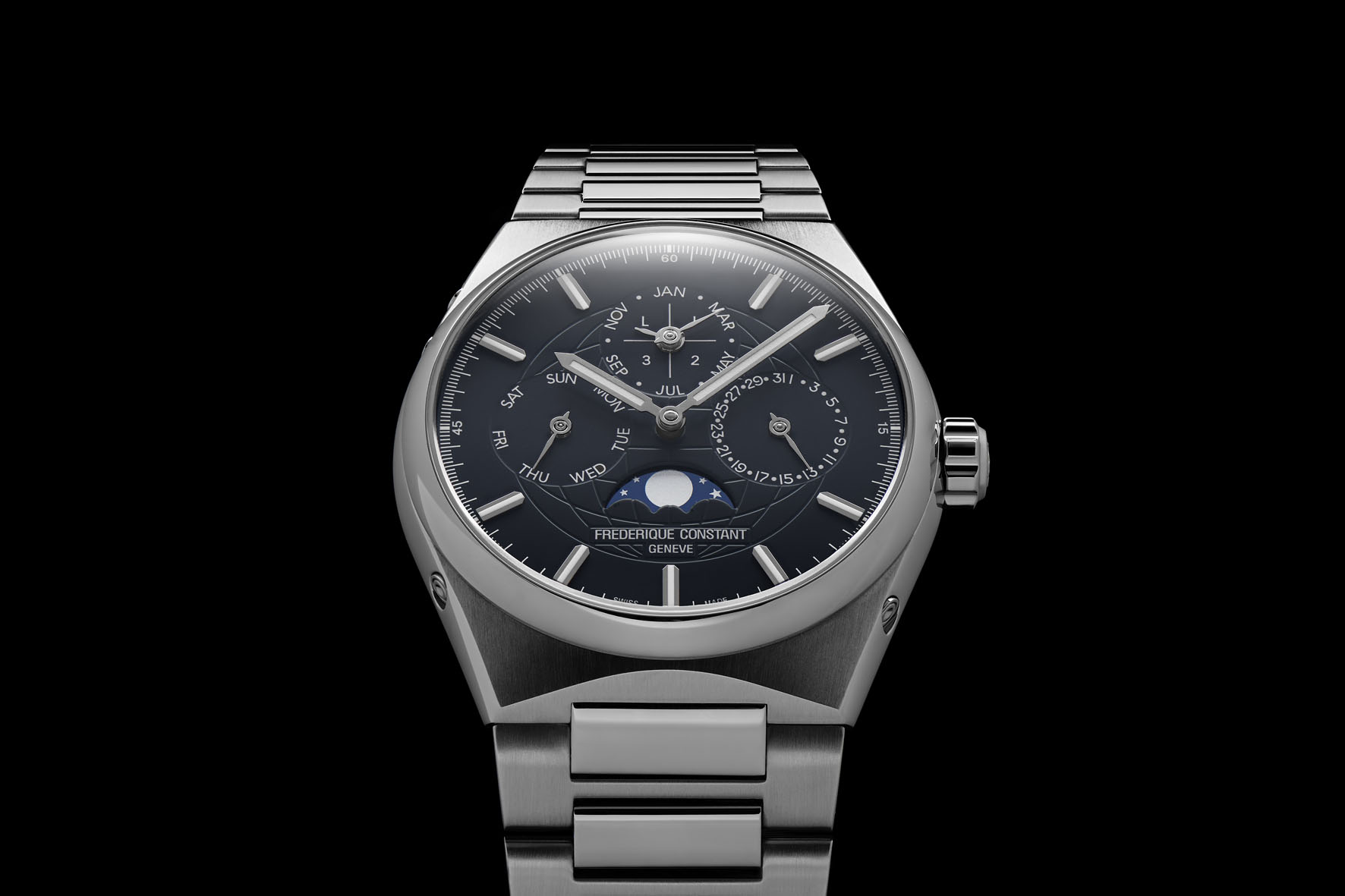 Questo nuovo blu-grigio garantisce una perfetta leggibilità grazie al contrasto con la tipografia bianca e grazie a indici e lancette luminescenti e lucidati a specchio. Si leggono il giorno a ore 9, i mesi e gli anni bisestili a ore 12, la data a ore 3 e le fasi lunari a ore 6. Al centro del quadrante, il classico motivo guilloché della Terra, firma estetica della collezione Highlife.