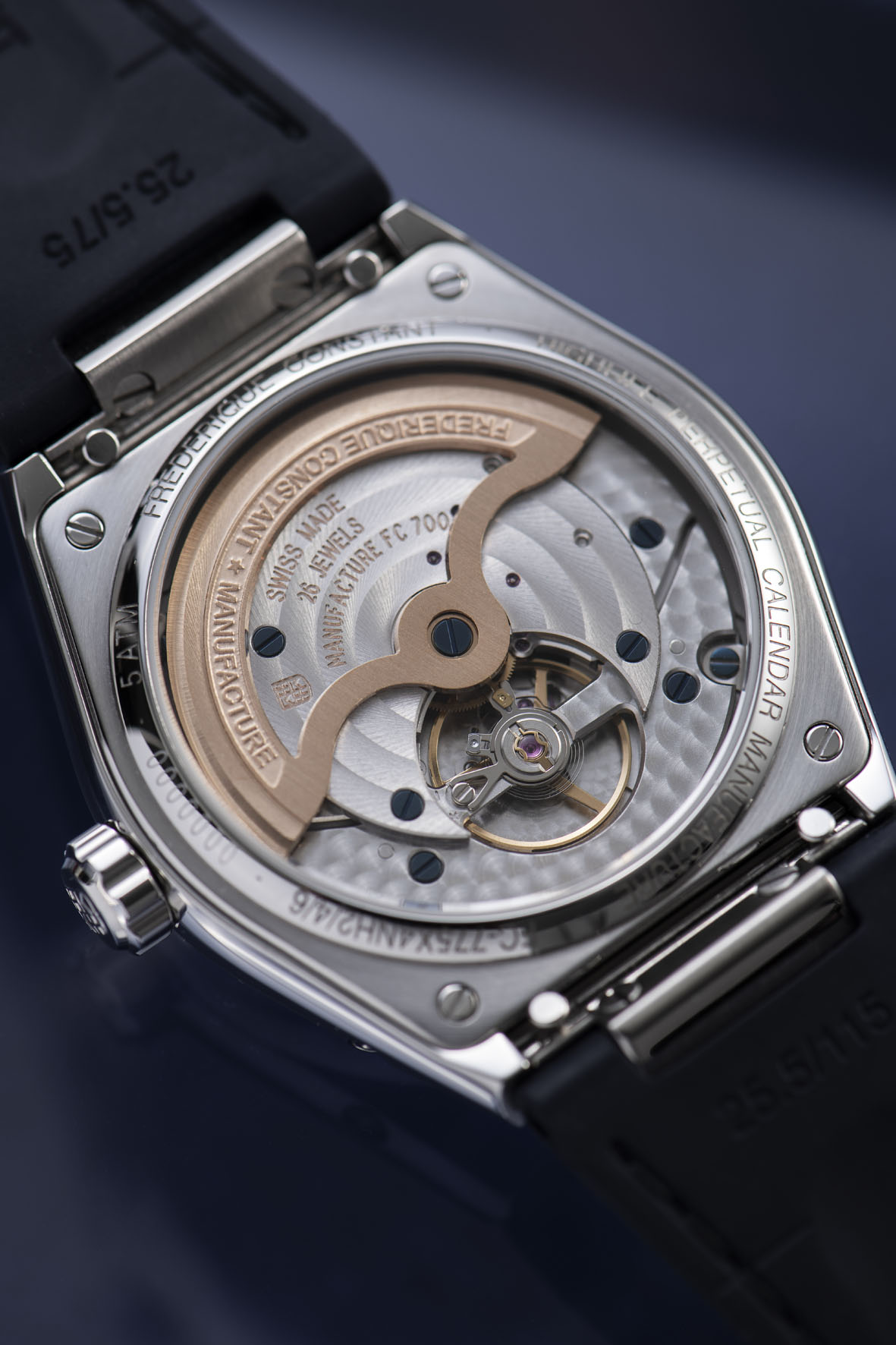Visibile attraverso il fondello aperto, all’interno del nuovo Frederique Constant Highlife Perpetual Calendar Manufacture Blue-Grey troviamo il calibro di manifattura FC-775 a carica automatica con 38 ore di riserva di carica. Prezzo ? imbattibile come sempre, appena 8.595 €.