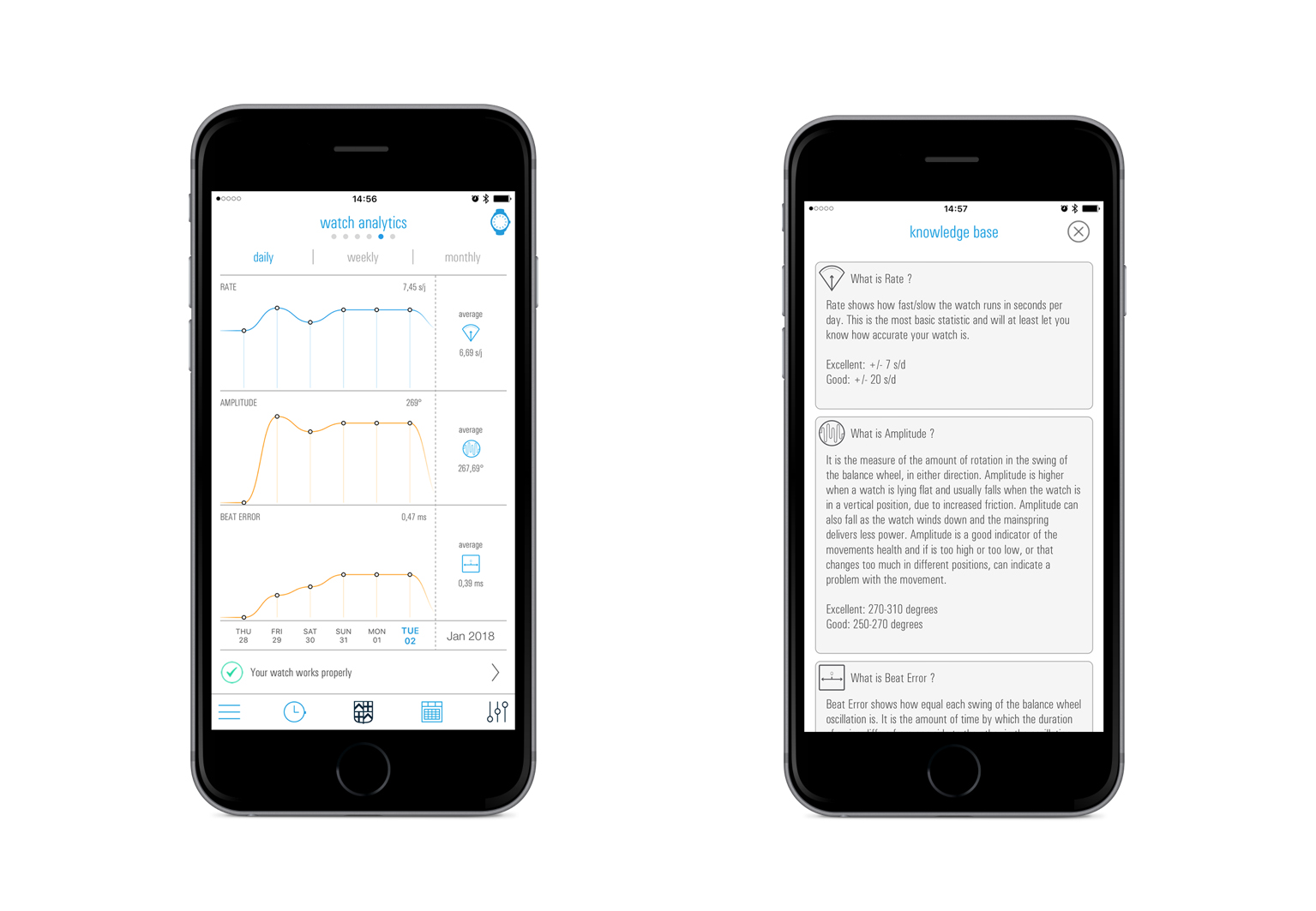 All’interno del calibro abbiamo integrato la nostra funzionalità brevettata di analisi del calibro, un algoritmo per rilevare il margine di errore di ritmo, ampiezza e battito. I risultati vengono comunicati all’App Hybrid via Bluetooth e si possono visualizzare sotto forma di grafico nel corso del tempo. Una volta al giorno, alle 4.00, l’orologio esegue un’analisi automatica (non è richiesta alcuna azione da parte dell’utente) del corretto funzionamento del movimento meccanico. All’interno del calibro analizziamo le oscillazioni del movimento con un sofisticato algoritmo. Vengono rilevate e registrate 3 misurazioni: il margine di errore del ritmo, dell’ampiezza e del battito.
