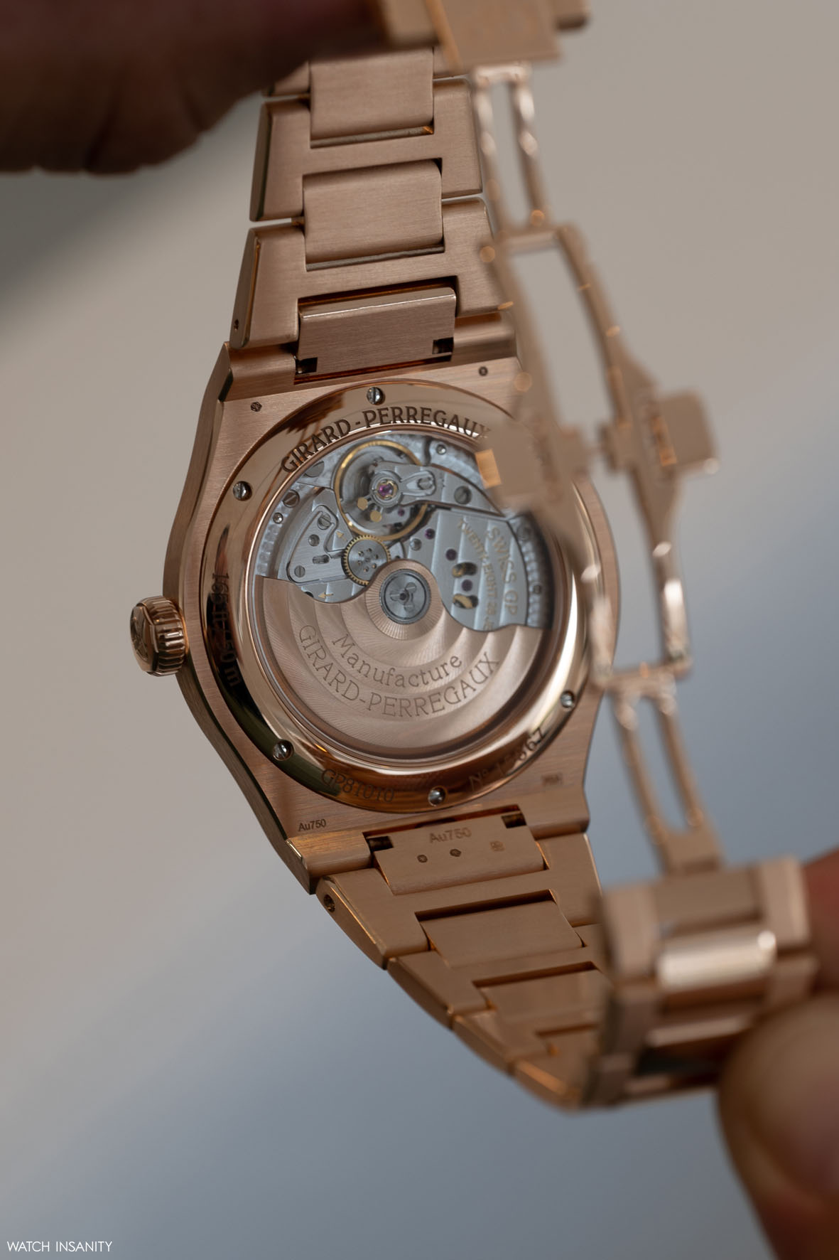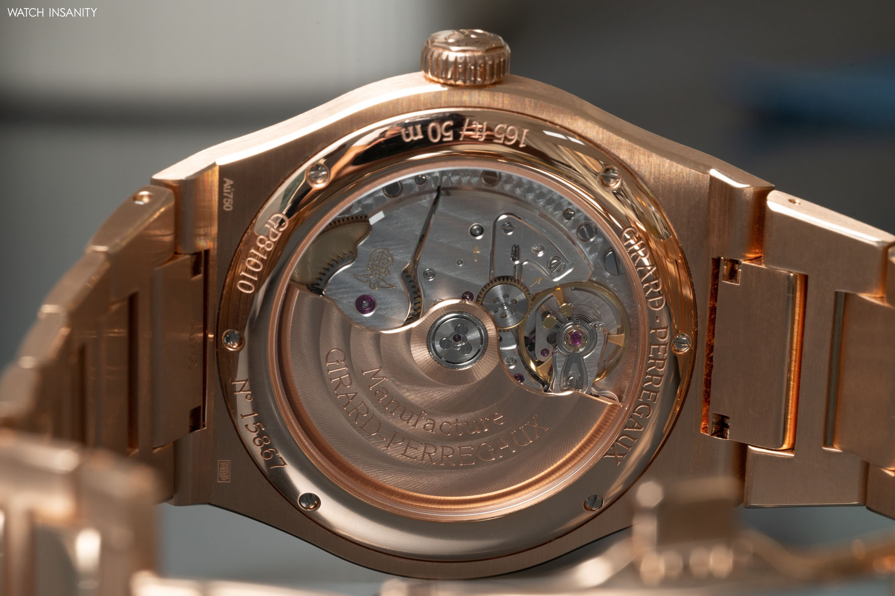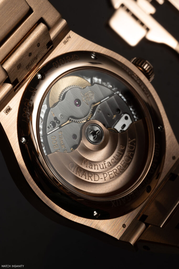 Il Laureato 42 mm Pink Gold and Onyx è mosso dal calibro GP01800-1404, un automatico realizzato dai maestri orologiai di Girard-Perregaux. Il calibro lavora a 28.800 alternanze/ora, ha una riserva di carica garantita di 54 ore ed è caratterizzato, oltre che dalle alte prestazioni, anche da finiture di altissimo livello, a partire dalla massa oscillante in oro rosa lavorata a Côtes de Genève circolare.