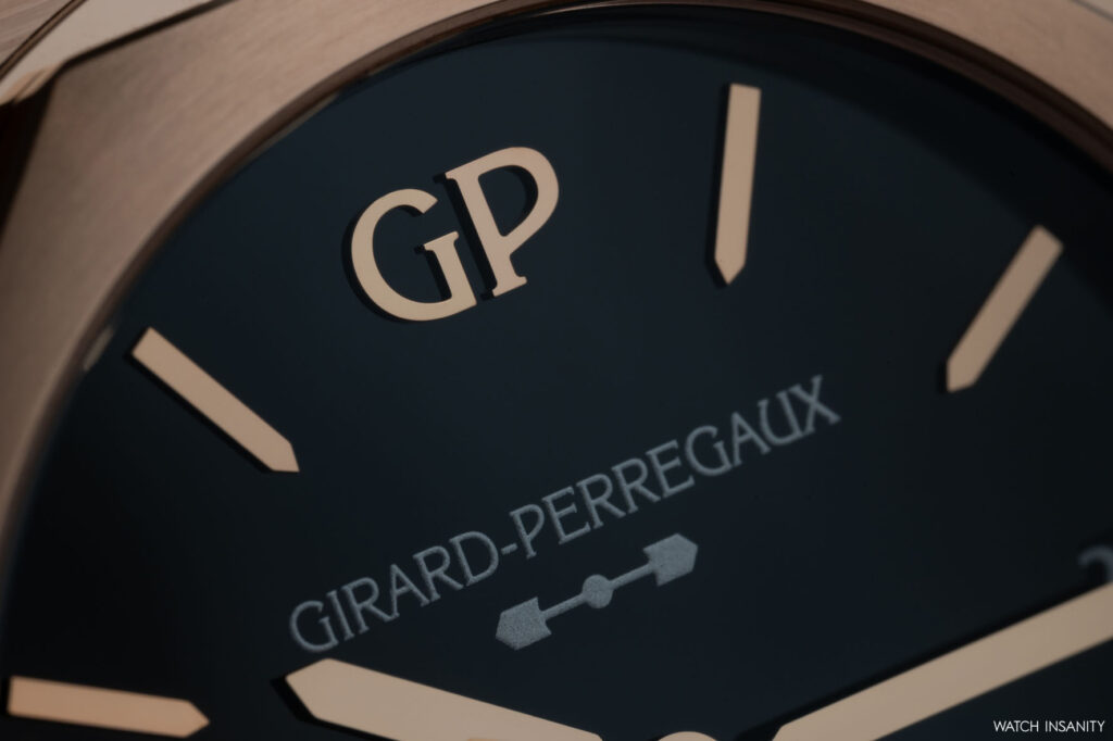 Per realizzarlo, questi artigiani eseguono 15 operazioni diverse che portano a una superficie perfetta e lucidata a specchio. Su di essa vengono poi posizionate le lancette, gli indici a bastone e il logo GP a ore 12, tutti in oro rosa. Un colore che, affiancato al nero intenso dell’onice, dà vita a un contrasto sorprendente.