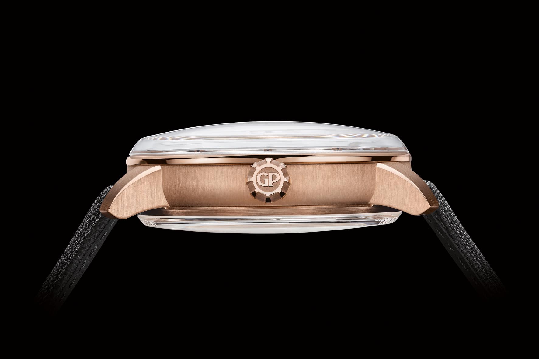Il calibro GP9530, ampiamente scheletrato e architettonico, conferisce al Minute Repeater Flying Bridges un carattere e un’estetica interessanti. Un look che è bilanciato da dettagli sottili e finiture che apportano un tocco di morbidezza e armonia al complesso dell’orologio. Il design della cassa ha un aspetto arrotondato e morbido con i vetri zaffiro superiore e inferiore anch’essi bombati. Prevalentemente satinata, la cassa contrasta notevolmente con le smussature lucide sulle anse e con la superficie esterna lucida sulla carrure.