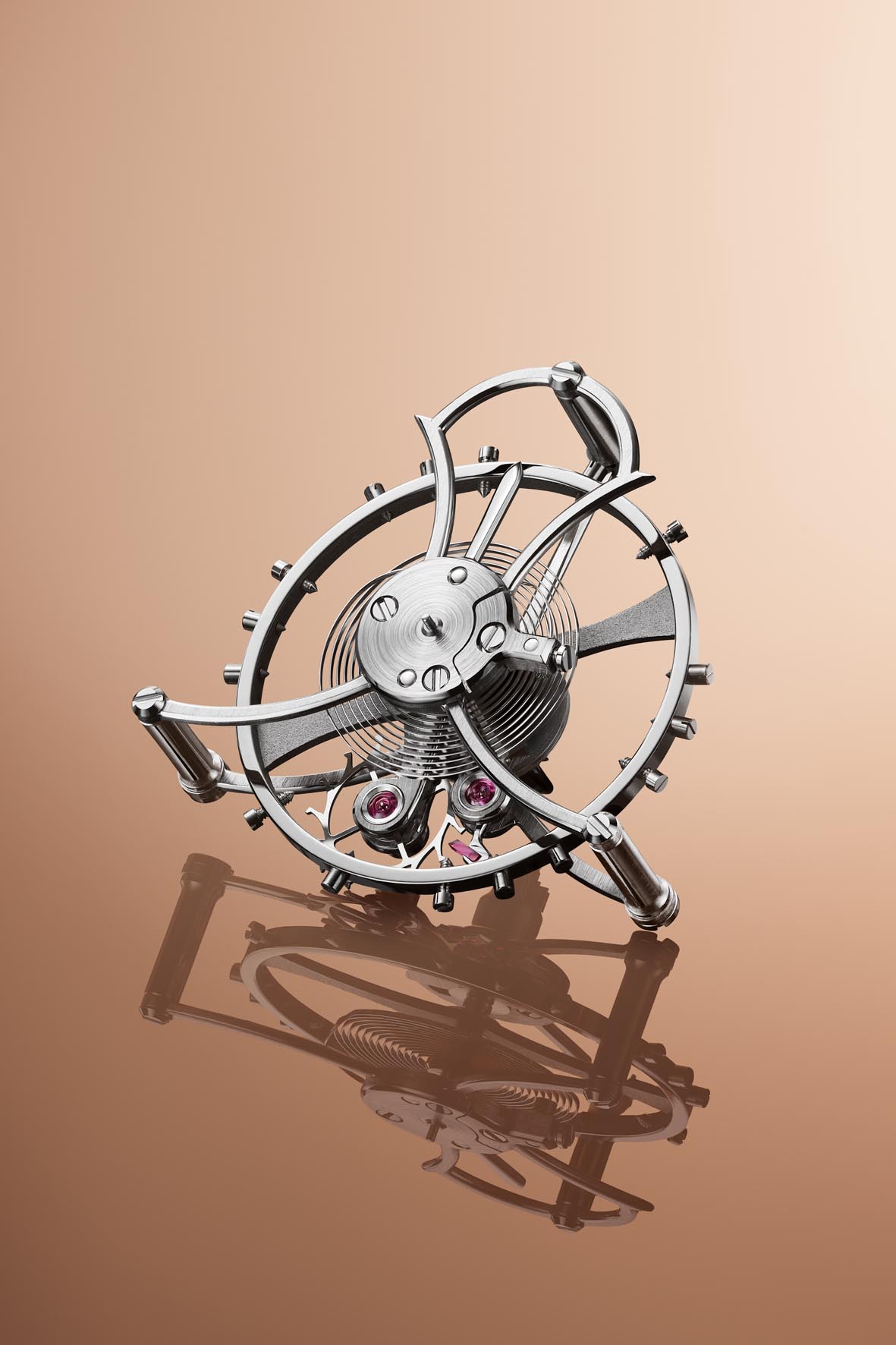 La vista aperta sul movimento necessita di un livello di finitura perfetto, richiesto dall’ampia scheletratura che genera ulteriori superfici da lavorare. Tutti i componenti sono rifiniti a mano, ciò significa che anche le superfici nascoste dei componenti del movimento sono decorate. Per esempio, il solo ponte del bariletto ha quattro finiture diverse tra parti visibili e nascoste. In totale, occorrono 240 ore per assemblare e decorare l’intero calibro. Così, 295 angoli interni lucidati a mano costituiscono il culmine del lavoro di decorazione eseguito su questo Minute Repeater Flying Bridges.