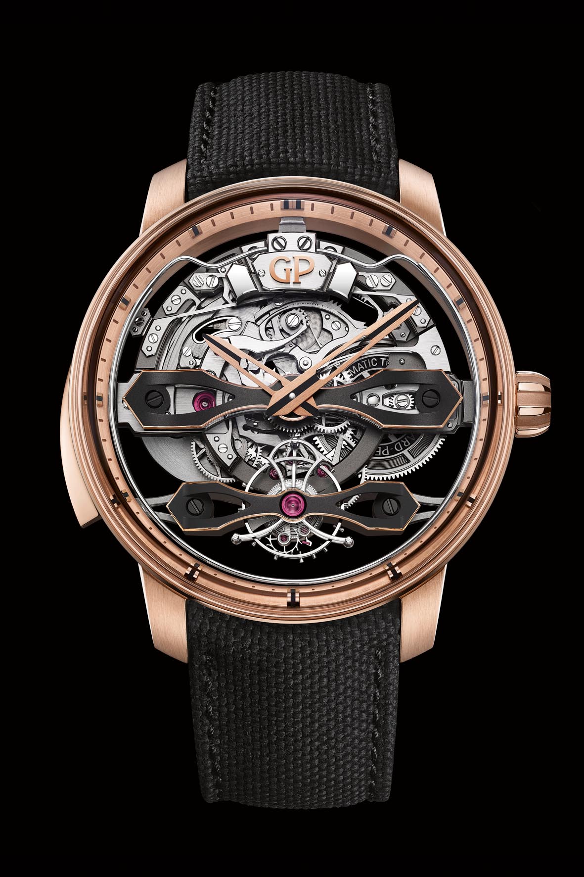 I freddi numeri ci dicono che il calibro automatico GP9530, con micro rotore in oro, ha una diametro di 43,55 mm, uno spessore di 10,75 mm, oscilla a 21.600 alternanze/ora, ha una riserva di carica minima di 60 ore, 475 componenti e 47 rubini e necessita di 200 ore per l’assemblaggio. Che è, appunto, il terzo movimento di manifattura presentato in sei mesi da Girard-Perregaux. Quello che i numeri non esprimono, però, è il risultato che la manifattura ha ottenuto unendo due tratti distintivi della propria storia e della propria eccellenza orologiera: la ripetizione minuti e i “Flying Bridges”, i ponti volanti.