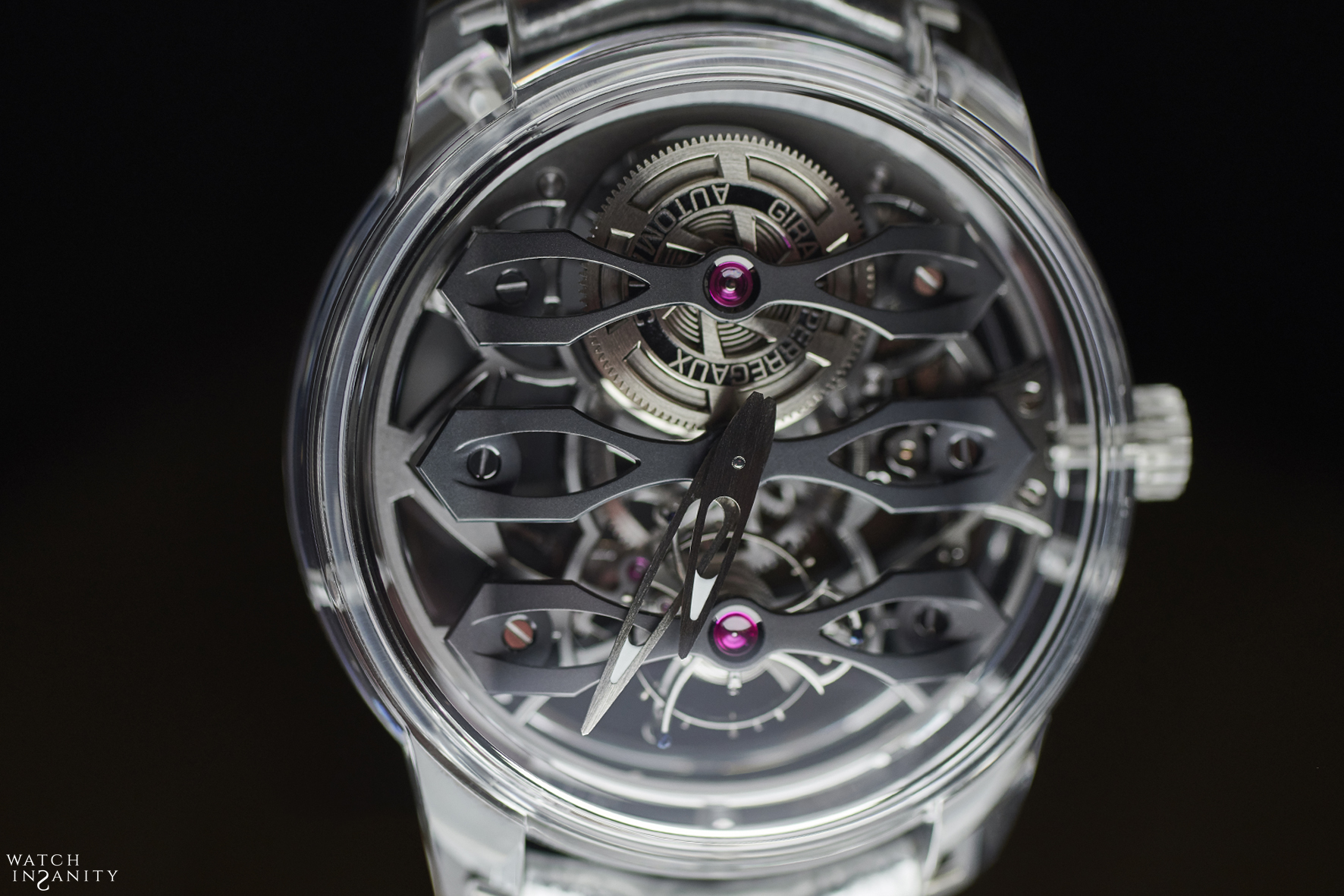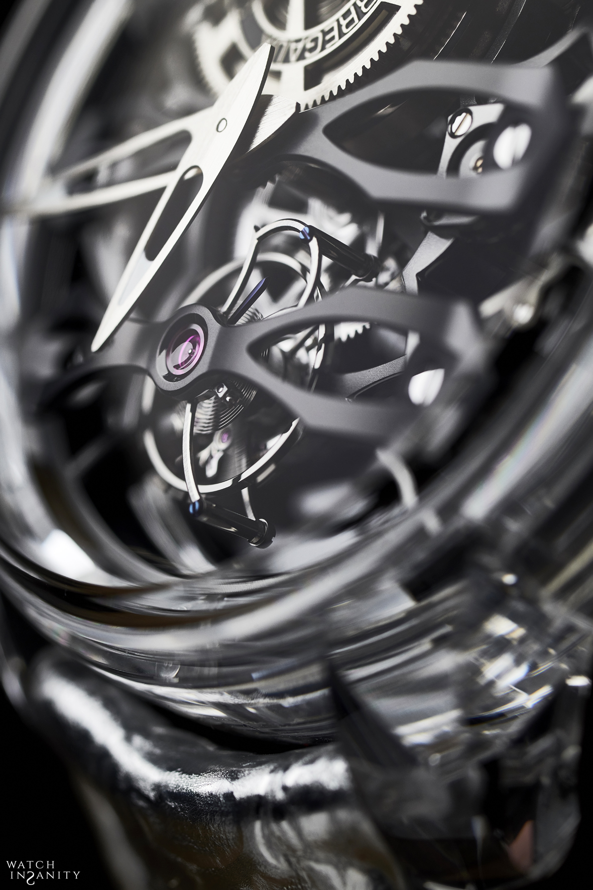 Il calibro GP9400-1035, automatico con Tourbillon, ore, minuti, piccoli secondi e riserva di carica di 60 ore è un’evoluzione del calibro 9400 finalizzata a farne sparire la platina. Il movimento si ritrova in levitazione, come se avesse il vuoto intorno.