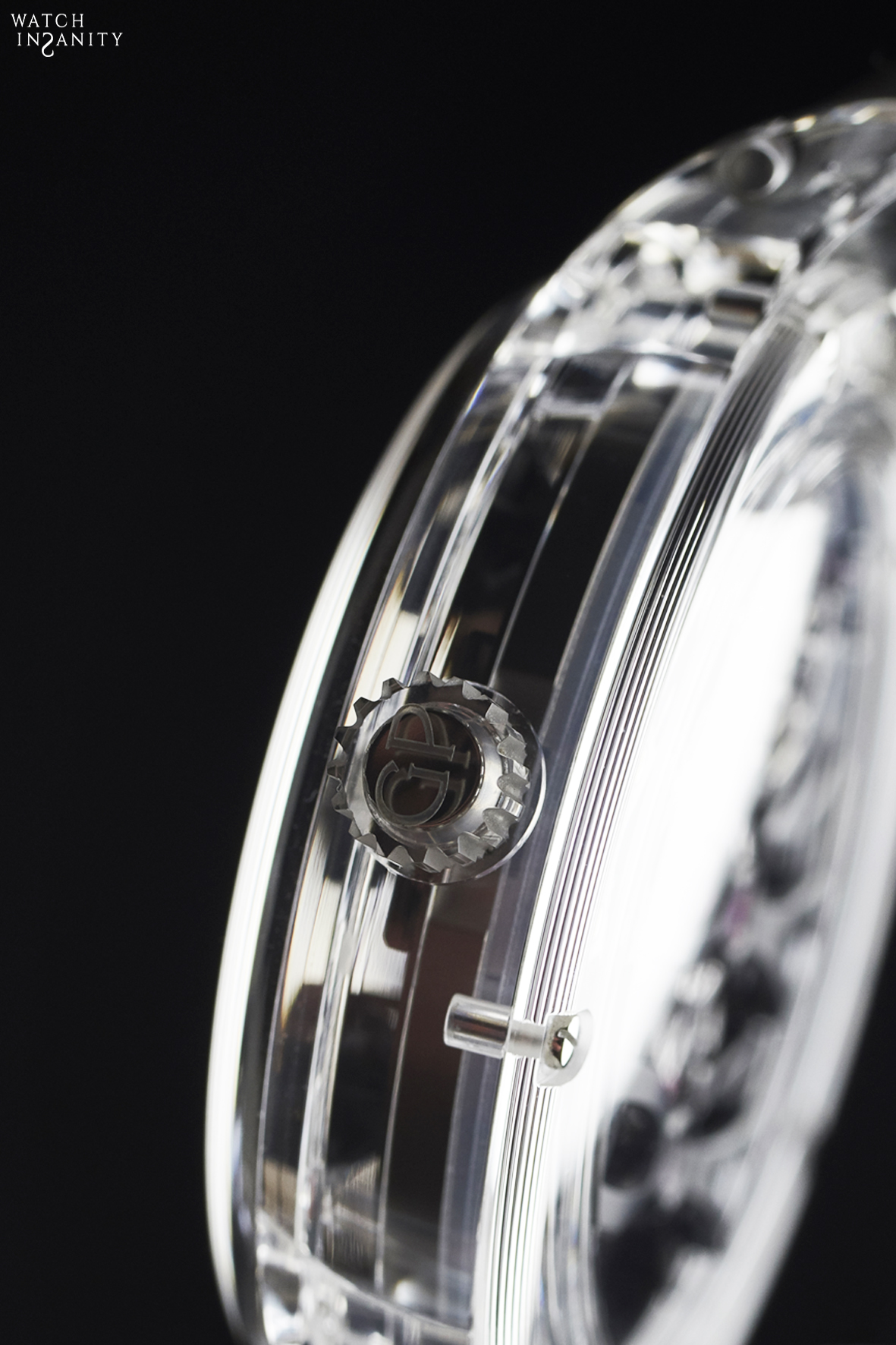 Con i suoi 45 mm di diametro, la cassa del Quasar è realizzata integralmente in vetro zaffiro, impermeabile a 30 metri. Una canna di vetro avvolge i ponti del movimento mentre la carrure è in un pezzo unico, arrotondata sui fianchi e spigolosa in corrispondenza delle anse.