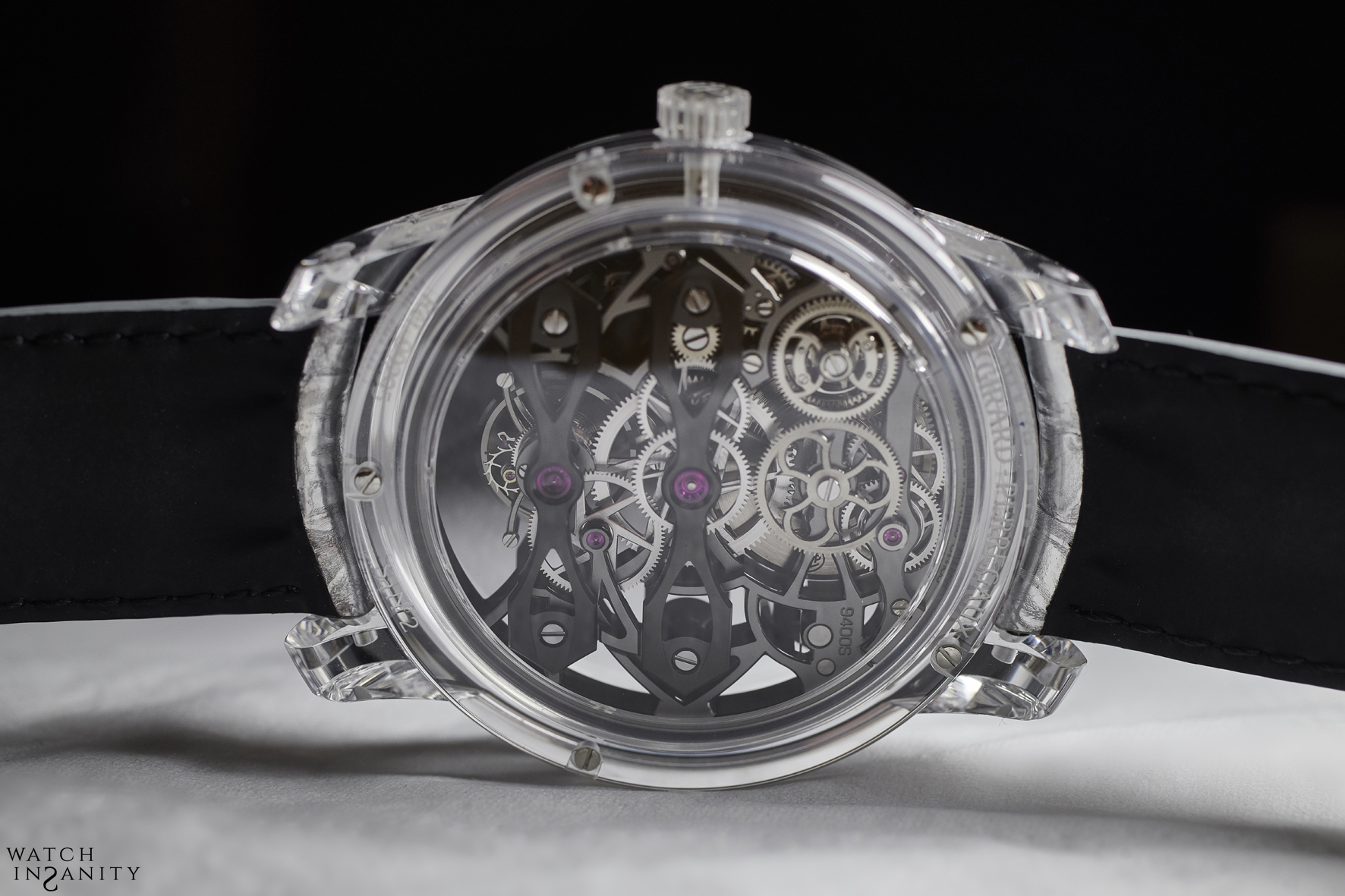 Già con il Laureato Con Tre Ponti Zaffiro del 2007, il cristallo di corindone aveva trovato posto all’interno della struttura stessa di un calibro d’Alta Orologeria.