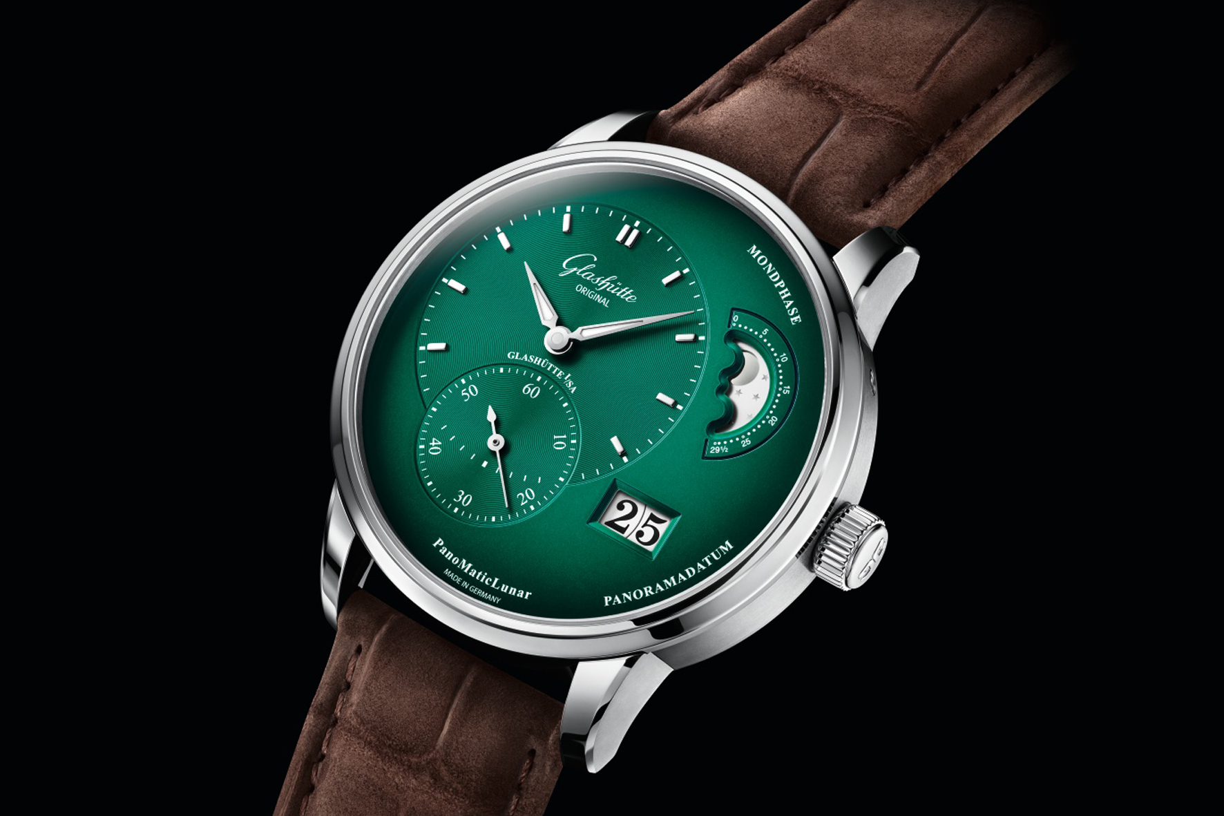 Per il colore dei suoi quadranti, Glashütte Original si ispira spesso alla bellezza dei Monti Metalliferi. Questa volta, il quadrante del nuovo modello PanoMaticLunar si tinge di sfumature verdi che ricordano i boschi di conifere che circondano la manifattura.