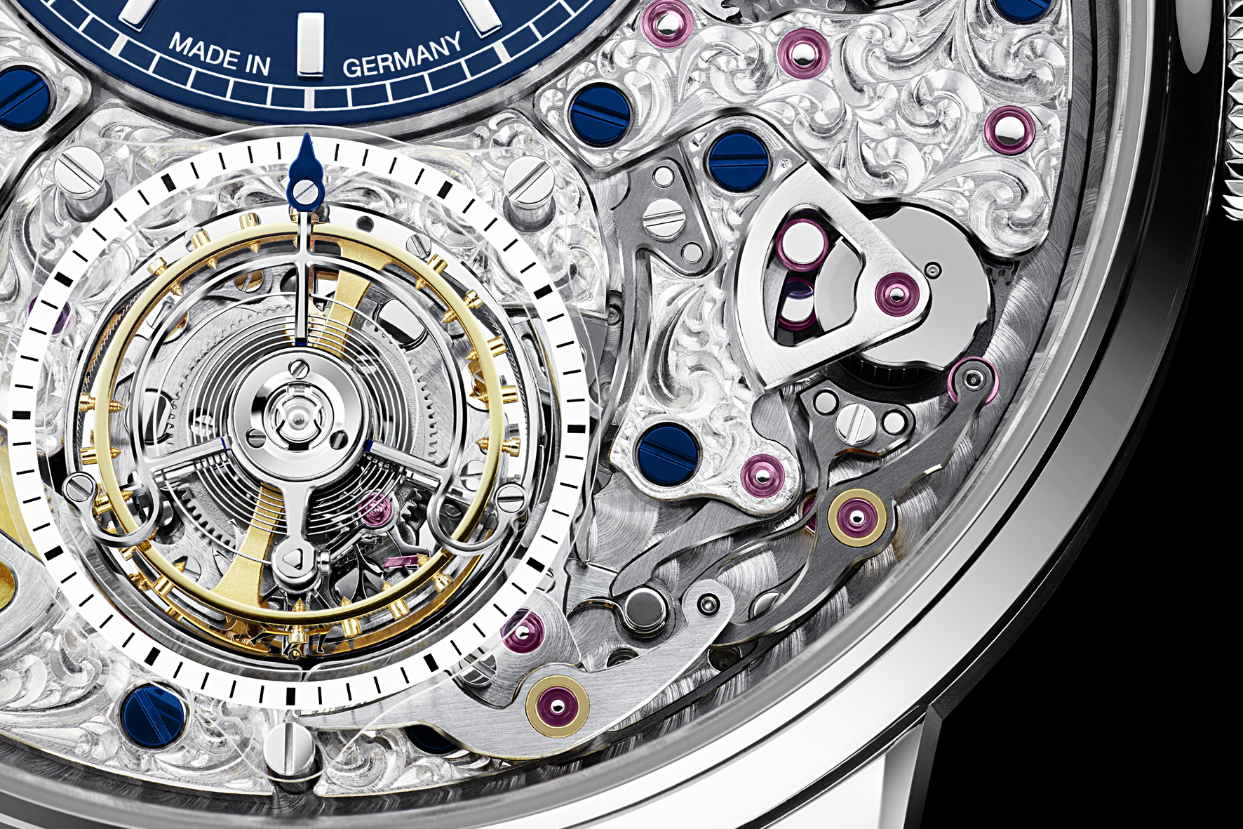 All’interno della cassa in platino da 42 mm è racchiuso il quadrante blu galvanico, con particolari applicati e un anello in vetro zaffiro parzialmente trasparente con scala dei secondi posizionato sopra la gabbia del Tourbillon. L’orologio è completato da una serie di incisioni realizzate a mano e dalla classica finitura a nastro di Glashütte.