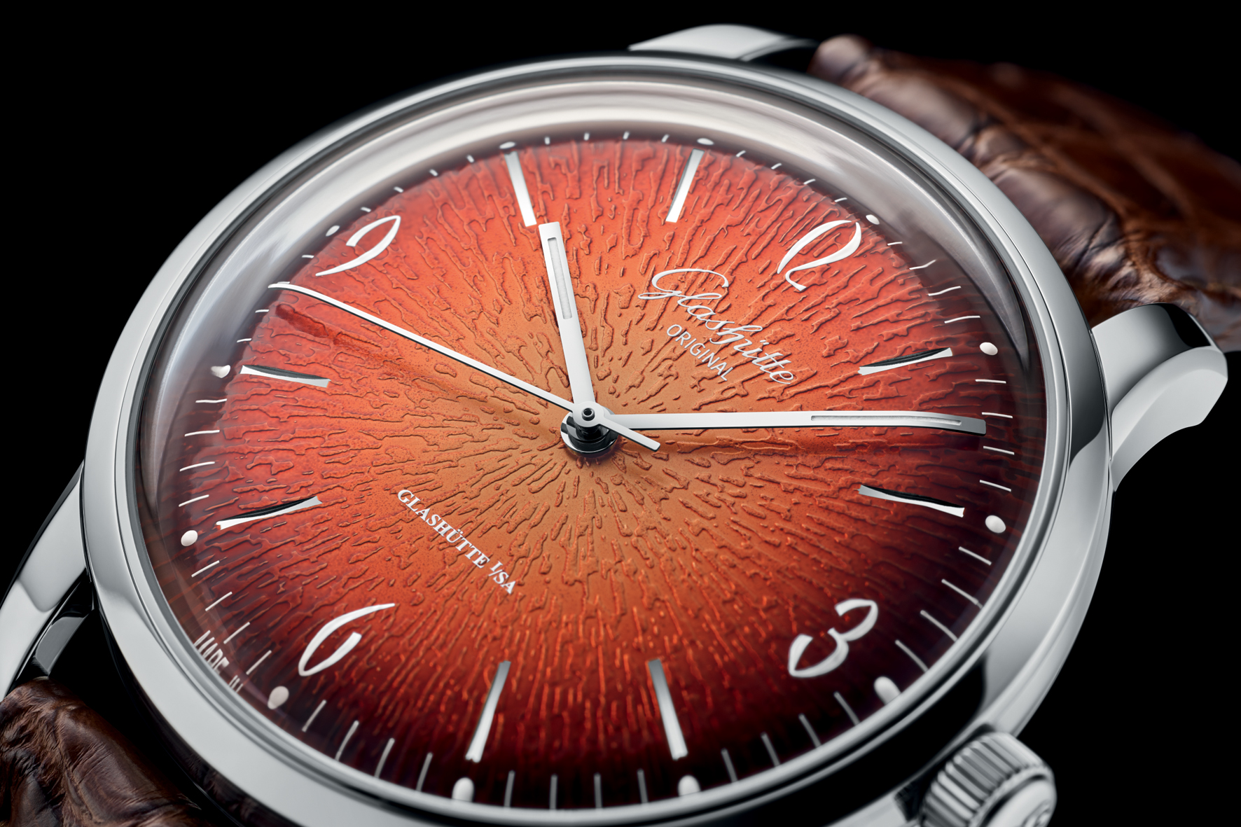 Partendo da un giallo oro al centro, il colore si spande lungo la superficie bombata trasformandosi prima in brillante arancione e poi in rosso prima di raggiungere la bordatura nera. Il merito di questo gioco di sfumature “effetto dégradé” va agli esperti della manifattura di quadranti di Glashütte Original a Pforzheim.
