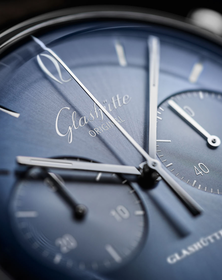 Caratterizzati da un design tipico degli anni 60 sottolineato dal vetro zaffiro bombato, le lancette ricurve e i numeri arabi, i nuovi Sixties 2020 presentano anche un particolare scintillio dei quadranti che si deve al lavoro degli esperti della manifattura interna di Glashütte Original. Qui i quadranti grezzi vengono lavorati con una finitura soleil prima di essere pressati nella caratteristica forma bombata e dotati di rivestimento galvanico in nichel. Per ottenere questo effetto dégradé vengono poi spruzzati con vernice blu che crea un bordo scuro. L’intera superficie del quadrante viene quindi ricoperta con una mano di vernice azzurro ghiaccio. Questa lavorazione manuale dà vita al colore sfumato sempre diverso che rende unico ogni quadrante. Infine i quadranti vengono riscaldati in forno per fissare i colori. Indici incisi, numeri stampati e tocchi di Super-LumiNova su tutti gli indici delle ore completano l’orologio.