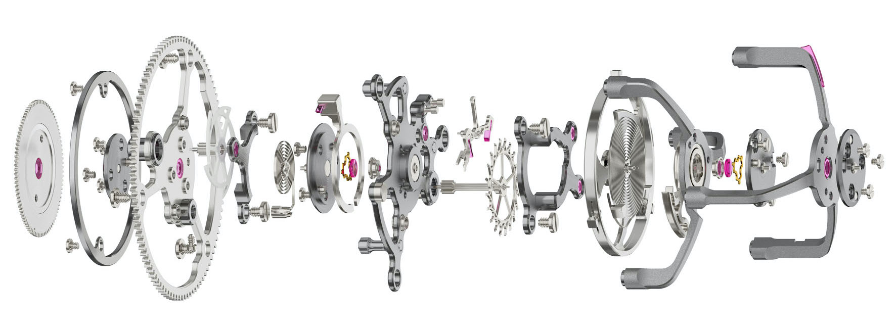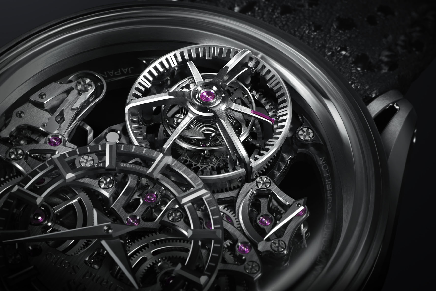 L’integrazione dei due meccanismi crea un effetto visivo sfolgorante. Il sistema interno del tourbillon ruota senza attrito, mentre il bilanciere vibra in modo uniforme a 8 oscillazioni al secondo, e la parte esterna a forza costante ne segue la rotazione a intervalli esatti di un secondo. I suoni dello scappamento e dell’impulso del meccanismo a forza costante, che avviene una volta al secondo, si armonizzano con questo ritmo visivo regolare per creare un battito appagante e rassicurante tanto per l’occhio quanto per l’orecchio. Nel suono, regolato su una sedicesima o semicroma, tonalità resa possibile grazie al fatto che il 9ST1 è il movimento con la frequenza più alta ad integrare un meccanismo a forza costante, vi è un fascino potente e gentile allo stesso tempo.