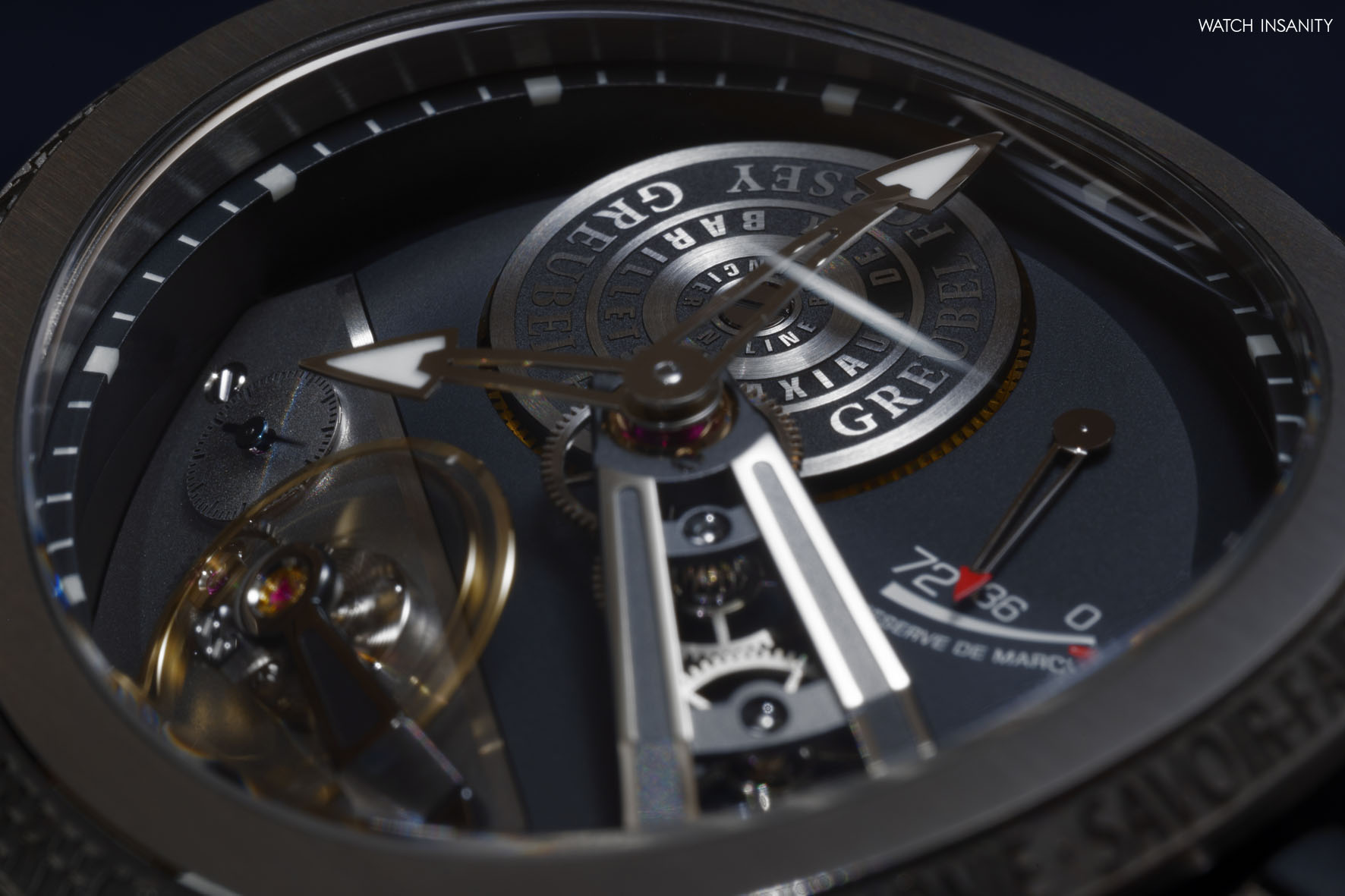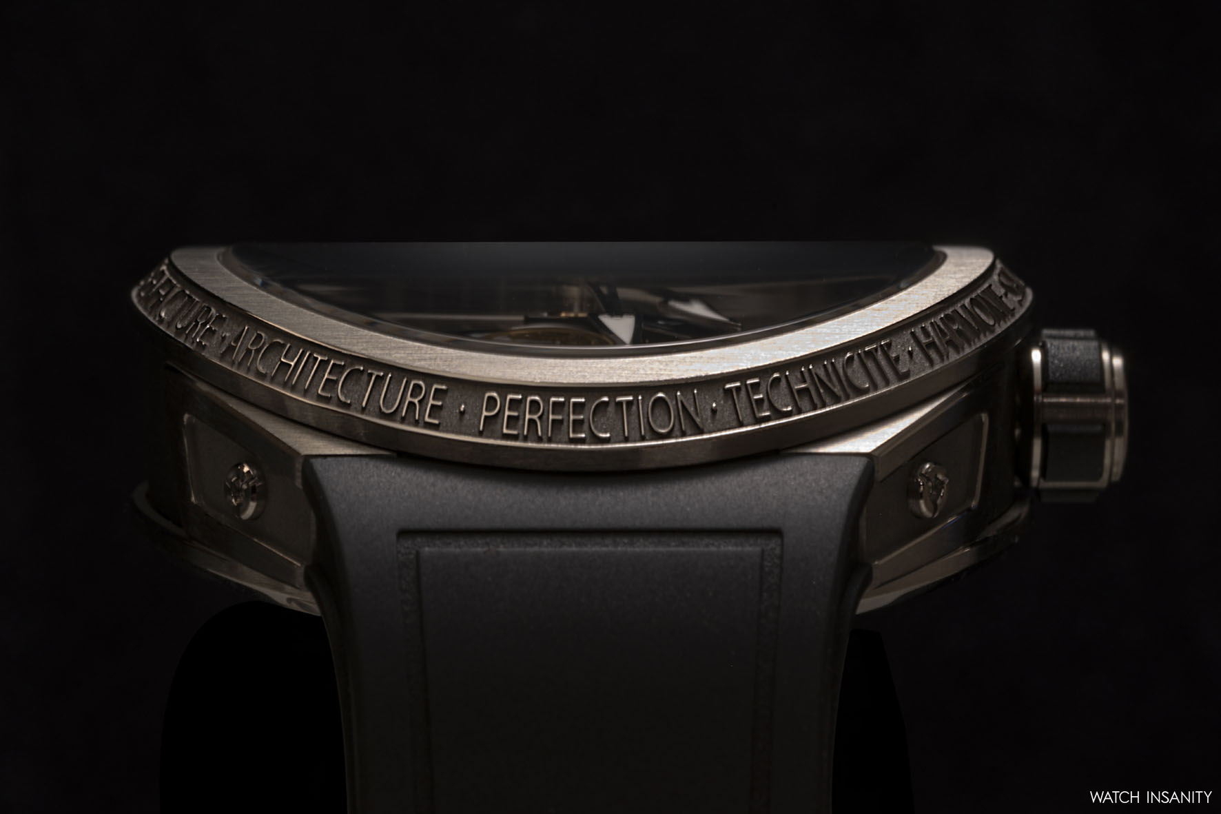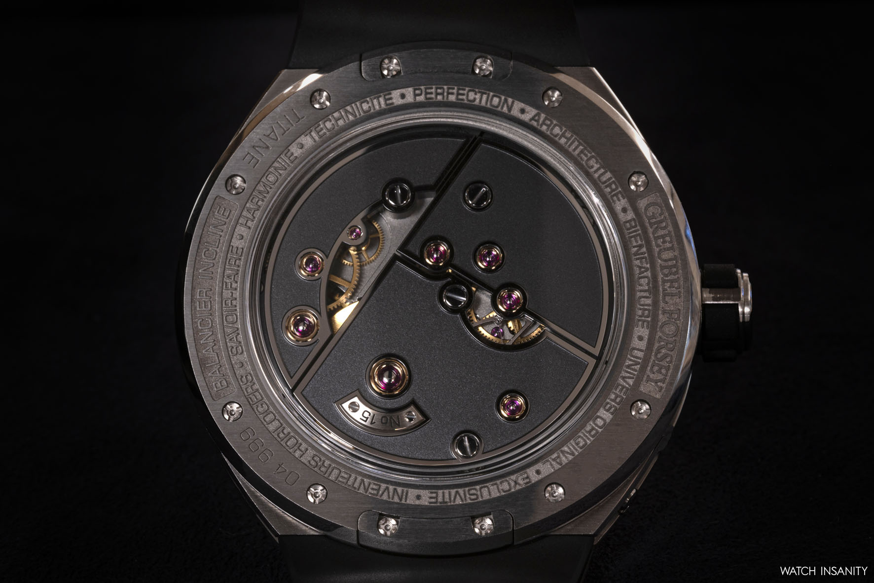 Quest’ultima reca incisi i valori chiave di Greubel Forsey, che troviamo già in altri orologi delle collezioni precedenti e che si ritrovano anche sull’anello del fondello, che è in vetro zaffiro quasi del tutto riempito dalle tre parti della platina: perfection, technicité, harmonie, savoir-faire, oeuvre, inventeurs horlogers, exclusivité, univers original, bienfacture, architecture.