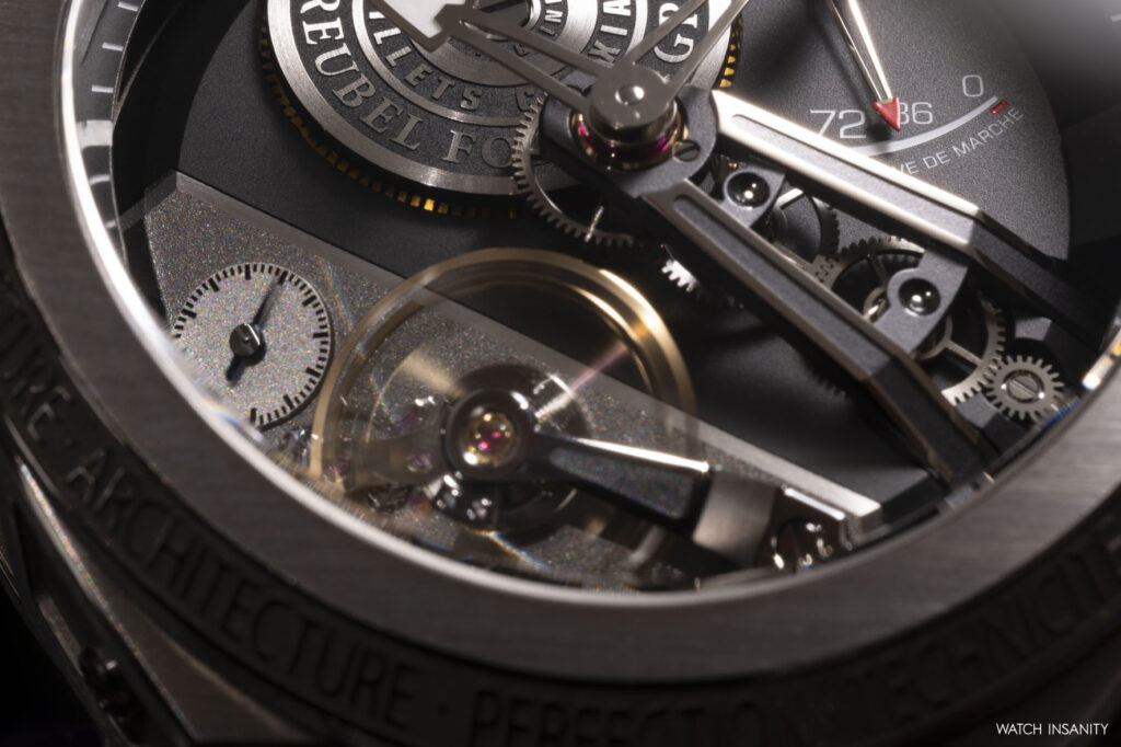 Robert Greubel e Stephen Forsey sanno come giocare con l’attenzione e la passione di chi ama i loro orologi. Proprio per questo, la funzione della lunetta è anche quella di portare l’occhio di chi indossa il segnatempo verso il quadrante. Che è la traduzione visiva del concetto di equilibrio che appartiene ai due maestri. Protetto da un vetro zaffiro ad arco e ovoidale, che segue la curva della cassa, spiccano sullo sfondo della platina nera (esiste anche con una versione in grigio) l’indicatore della riserva di carica, inciso e laccato, in un settore a ore 2 con una lancetta traforata dalla punta rossa, le lancette in acciaio lucido traforate e profilate di ore e minuti e il contatore in oro dei piccoli secondi sul piano inclinato dello scappamento a ore 8.