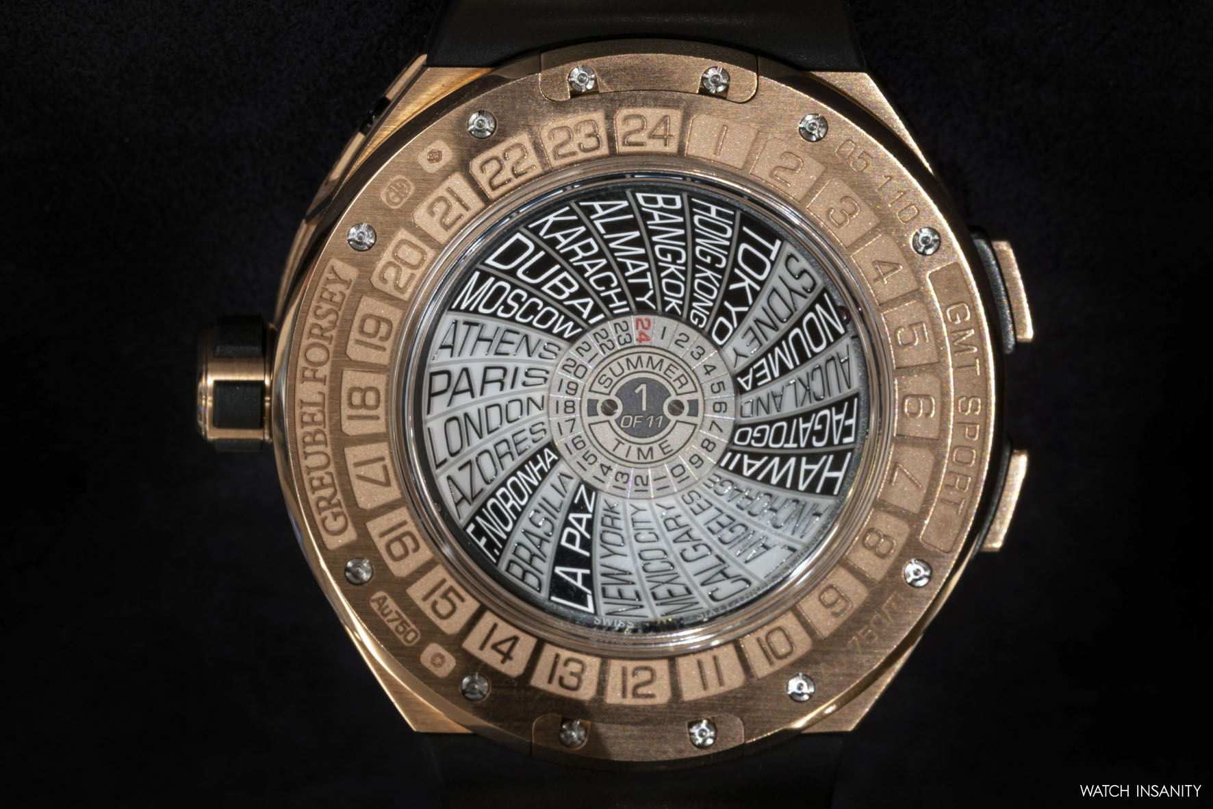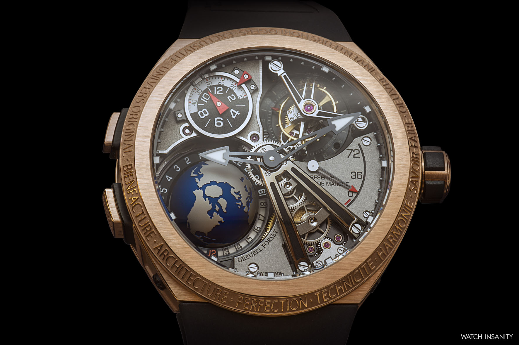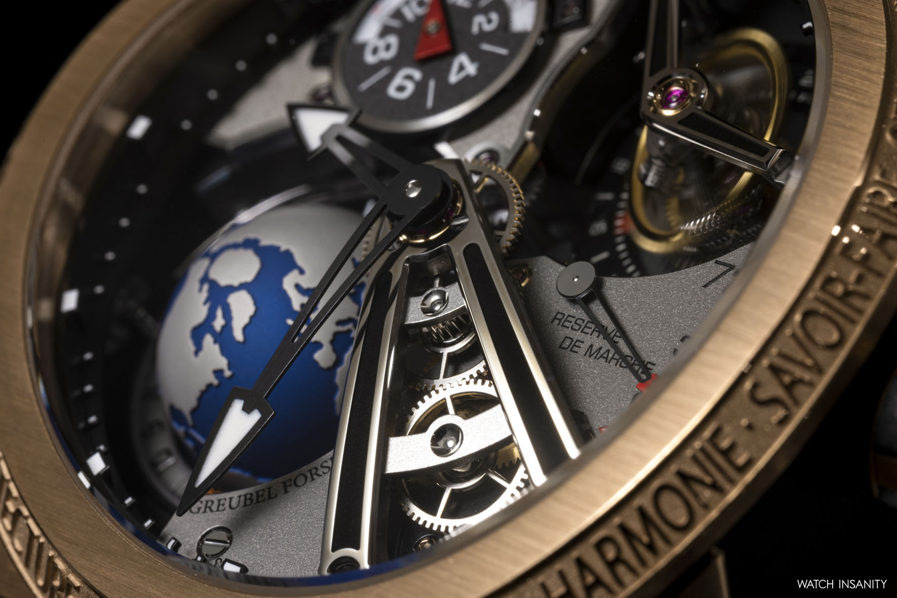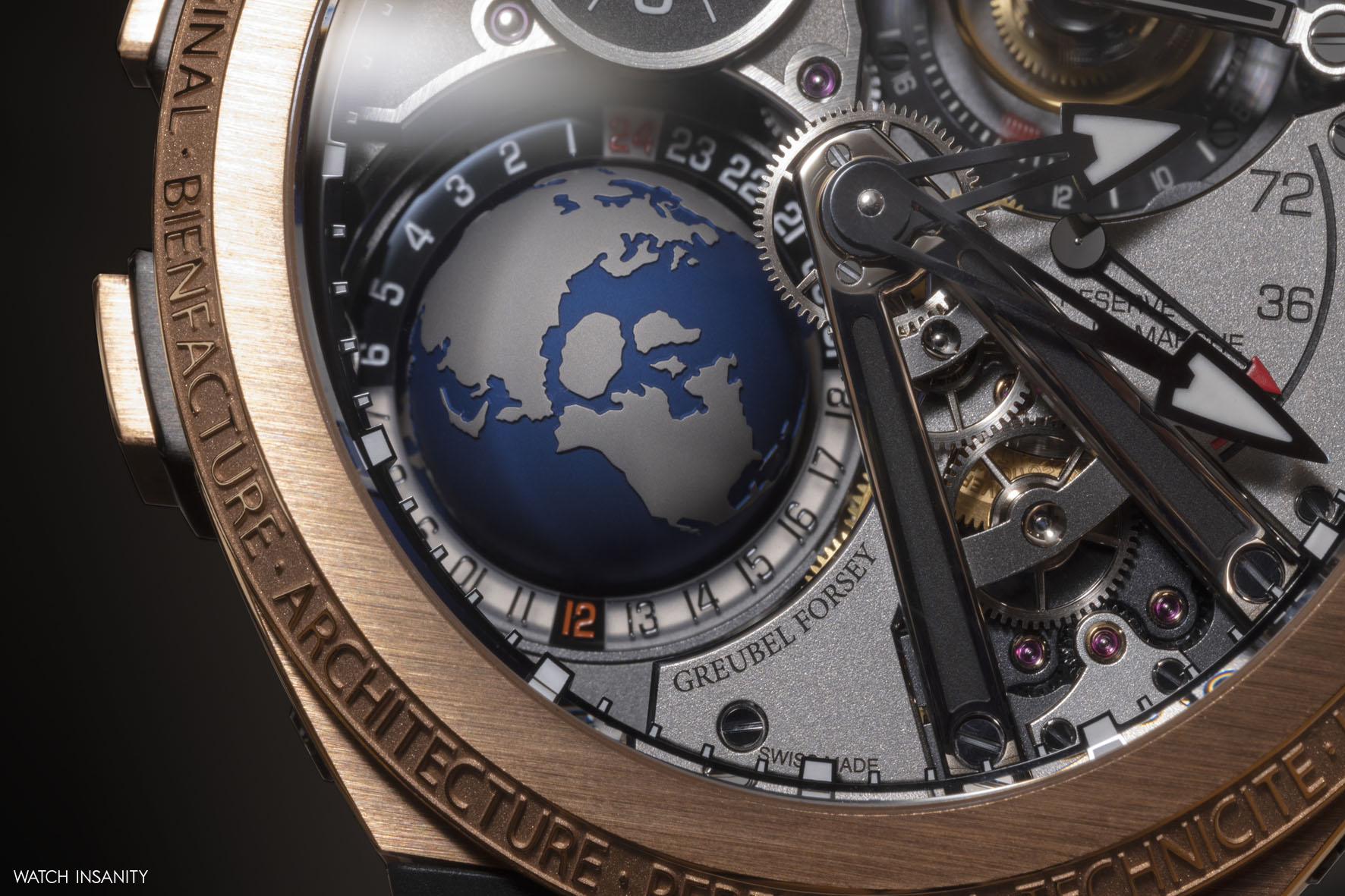 Mentre l’estetica tridimensionale del quadrante – a suo modo stupefacente come in ogni Greubel Forsey – resta la medesima della prima limited edition con ore e minuti al centro sul ponte ad arco; secondo fuso nel quadrante tra le 10 e le 11; e, sotto, globo terrestre (con visuale dal Polo Nord) che compie un giro completo intorno al proprio asse in 24 ore in senso antiorario visualizzando l’ora universale e l’ora locale per tutte le longitudini (indicazione che si replica anche sul fondello dove abbiamo ancora l’ora universale e quella dei 24 fusi orari);