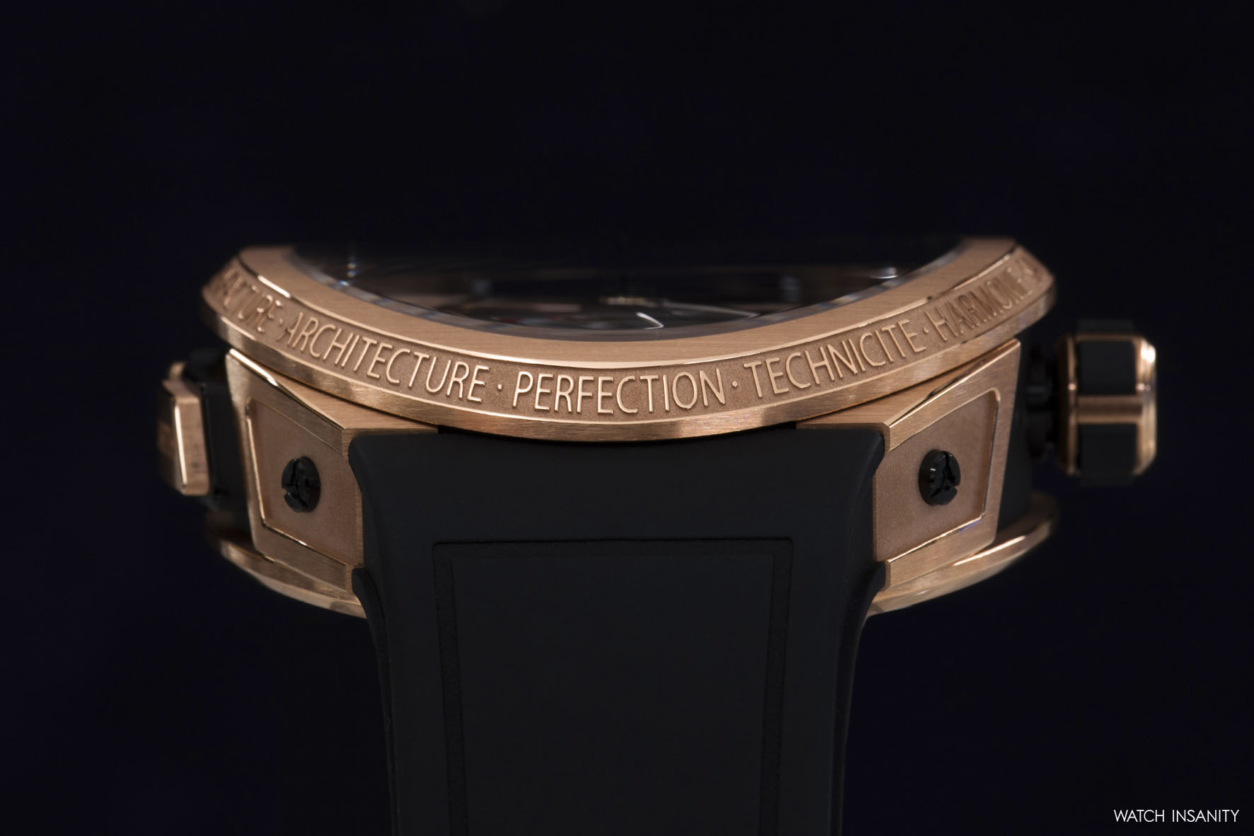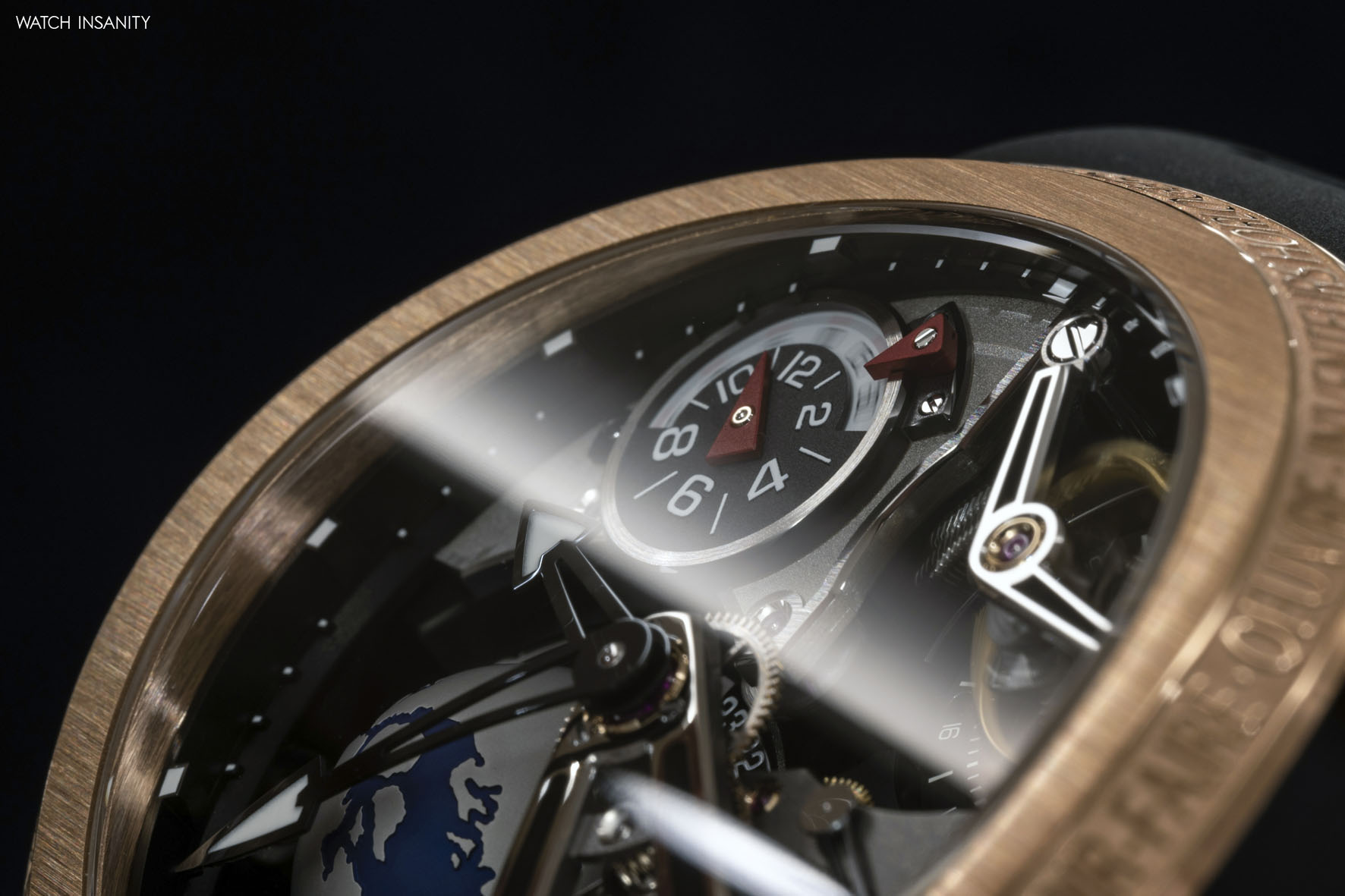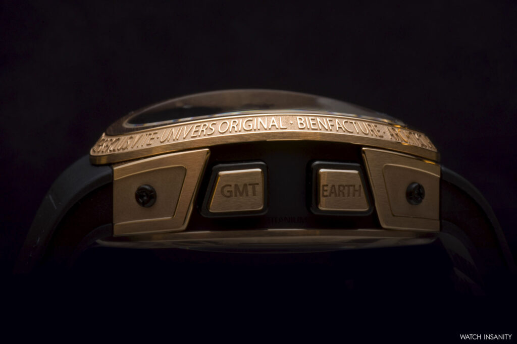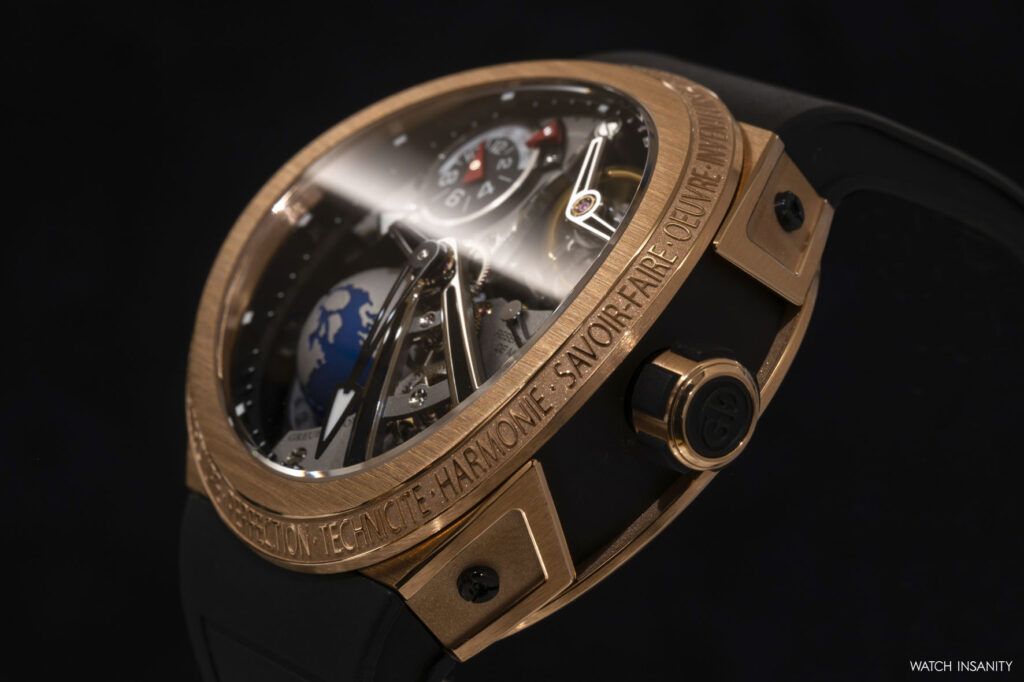 Rispetto all’originale GMT Sport in titanio e dettagli blu – oggi esaurito e che due anni fa ha sbalordito il mondo dell’orologeria per le sue forme mai viste prima con cassa curva e ovoidale che a suo tempo abbiamo presentato qui – la nuova versione si impreziosisce dell’oro rosso su cassa e globo terrestre con il titanio che resta soltanto su carrure, corona, pulsanti e nella deployante, per una combinazione estetica davvero potente, che inevitabilmente renderà ricercatissimi gli 11 esemplari di questa nuova edizione limitata.