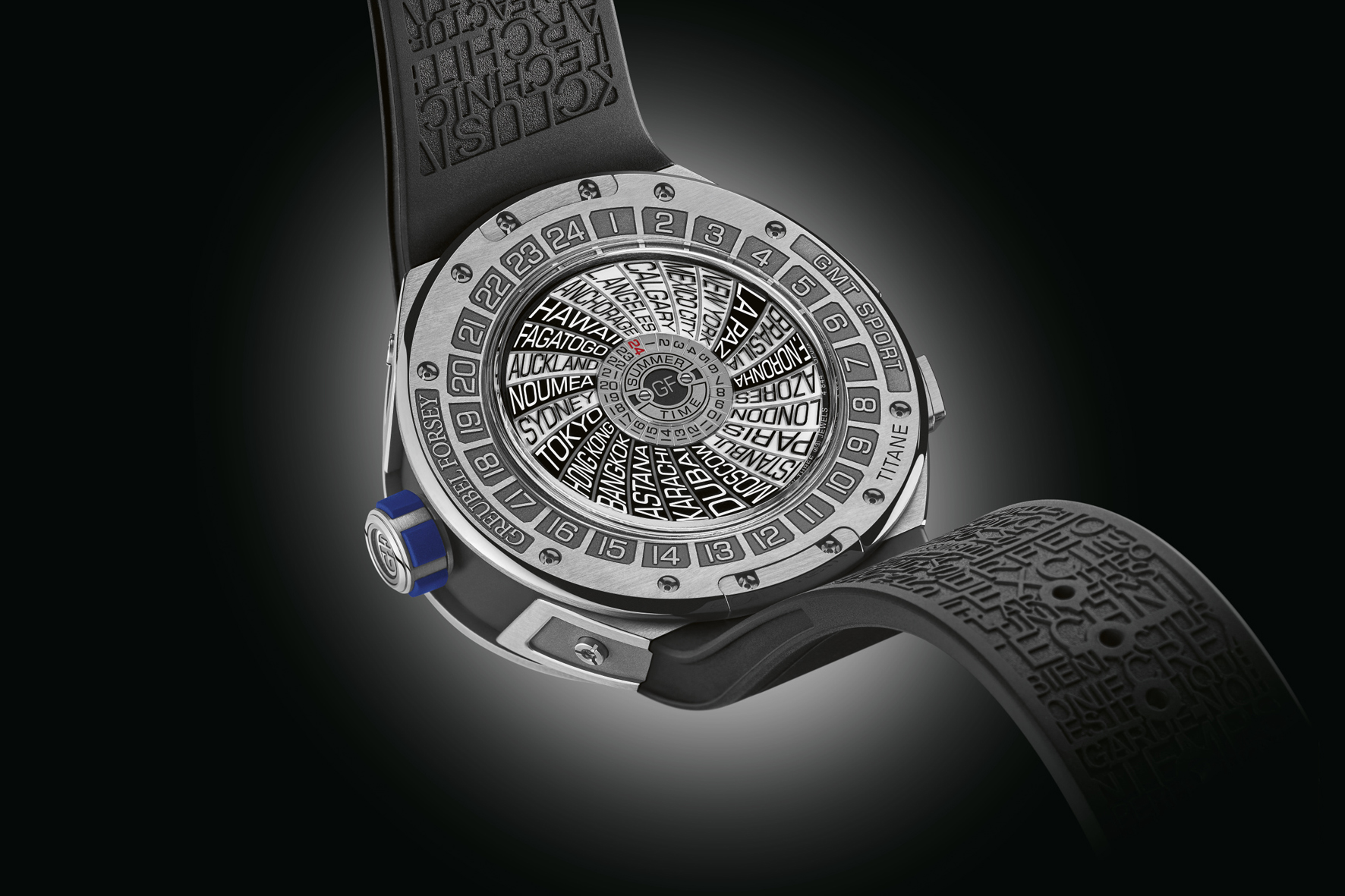 In questo meccanismo GMT con doppio brevetto, l’indicazione del secondo fuso orario sul quadrante supplementare posizionato tra le ore 10 e le ore 11 si associa a una visualizzazione dell’ora universale, che consente di leggere intuitivamente l’ora ovunque nel mondo. La rotazione del globo terrestre (visto dall’alto del Polo Nord), in grado di compiere un intero giro intorno al proprio asse in 24 ore in senso antiorario, si rivela uno spettacolo straordinario e innovativo. Il globo è circondato da un disco in vetro zaffiro suddiviso nelle 24 ore, su cui è possibile leggere l’ora locale per tutte le longitudini, incluso l’indicatore giorno/notte (zone luminose/buie). Sul lato fondello del GMT Sport, un anello esterno e uno centrale completano il disco delle città in vetro zaffiro, offrendo l’indicazione dell’ora universale e di quella legale per 24 città nei principali fusi orari. Il disco distingue i fusi orari che applicano l’ora legale (su sfondo chiaro) da quelli che non la applicano (su sfondo scuro).
