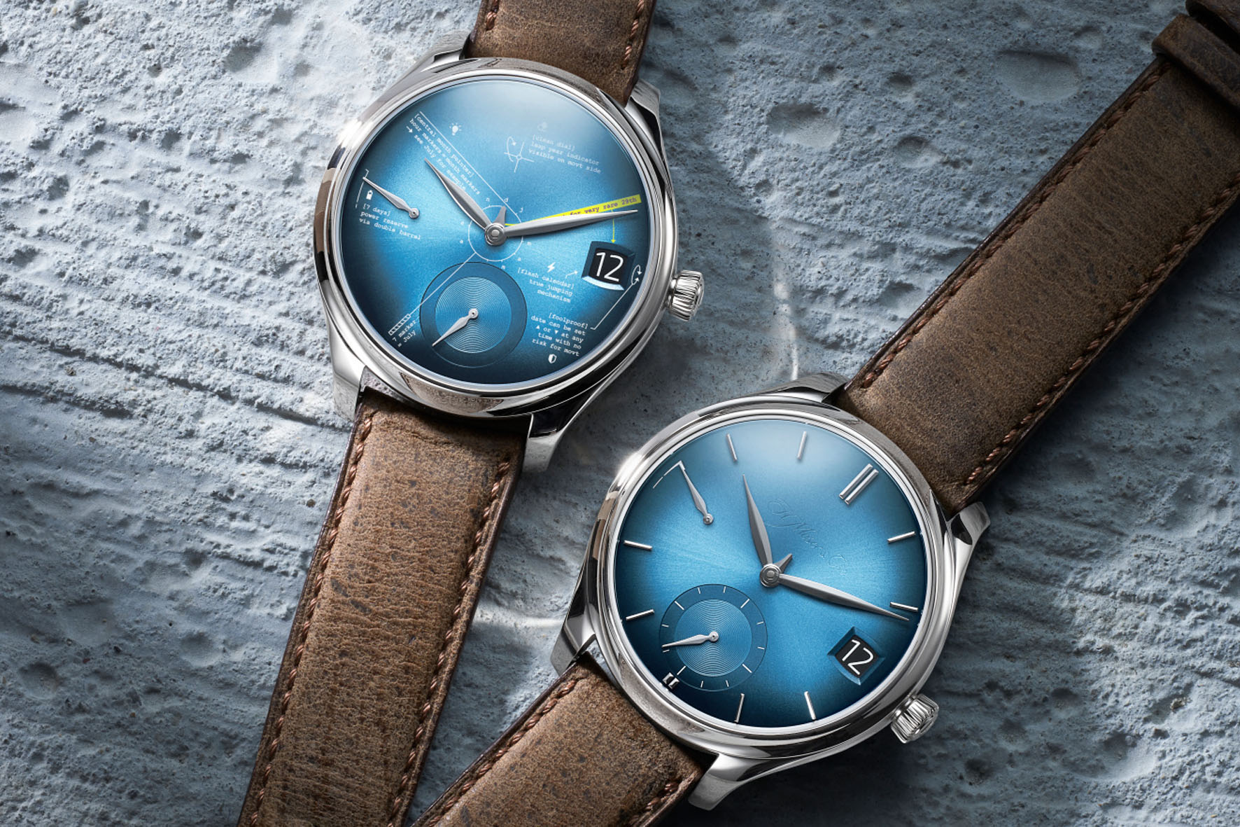 Questa serie speciale prende in contropiede la filosofia minimalista del brand, il cui calendario perpetuo solitamente ne è il perfetto esempio con il suo quadrante puro e le funzioni intuitive. All’interno di un esercizio di stile dai toni stravaganti, H. Moser & Cie. interpreta il quadrante dell’orologio, impreziosendolo con dei disegni e delle note che riassumono le funzioni di questo movimento utilizzabili da chiunque. Come ad esempio la scritta “[clean dial] leap year indicator visible on movt side” che indica di girare l’orologio per vedere l’indicatore dell’anno bisestile posizionato sul lato del movimento visibile attraverso il fondello in vetro zaffiro.