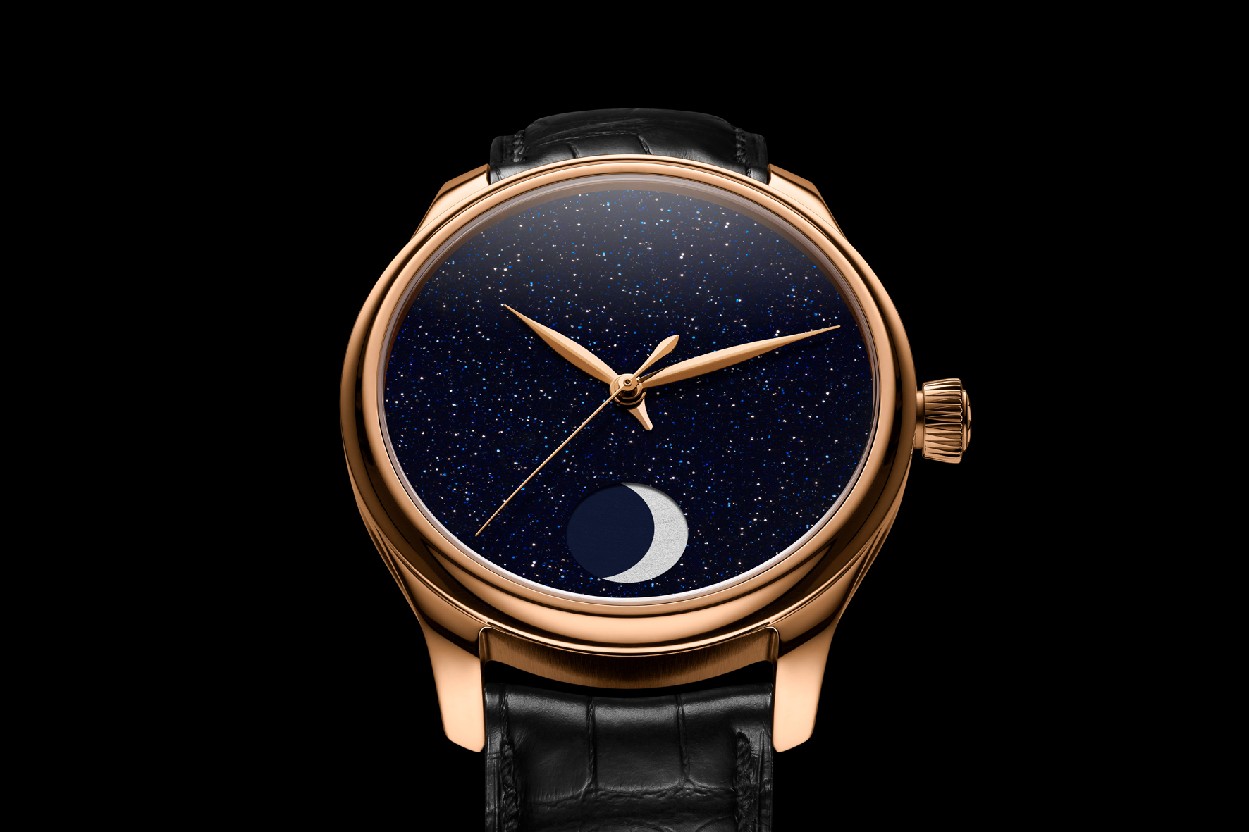 Per questa ode alla purezza, H. Moser & Cie. ha scelto un quadrante Concept, senza indici né logo. Per esaltare la bellezza della luna, la Maison ha scelto un quadrante in avventurina, che luccica con le sue inclusioni luminose, ricordando le costellazioni del cielo notturno.