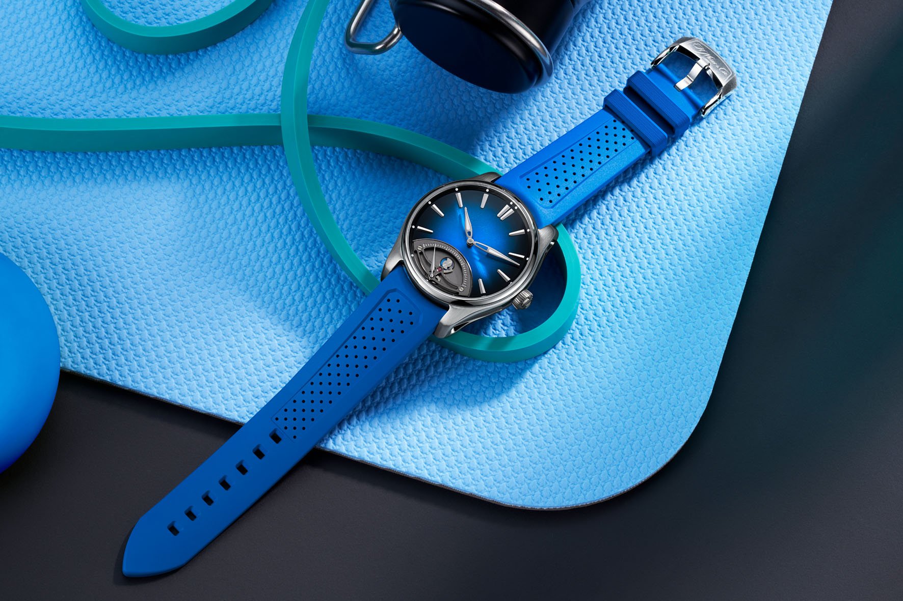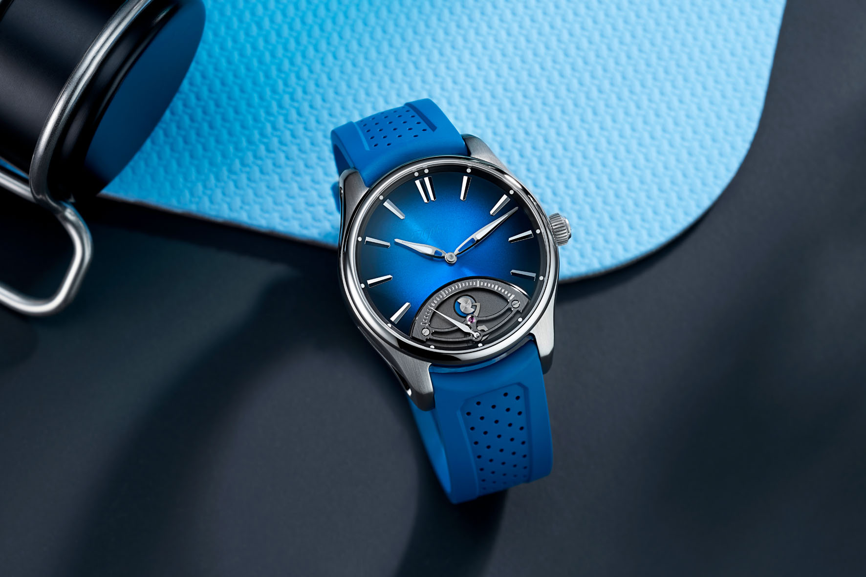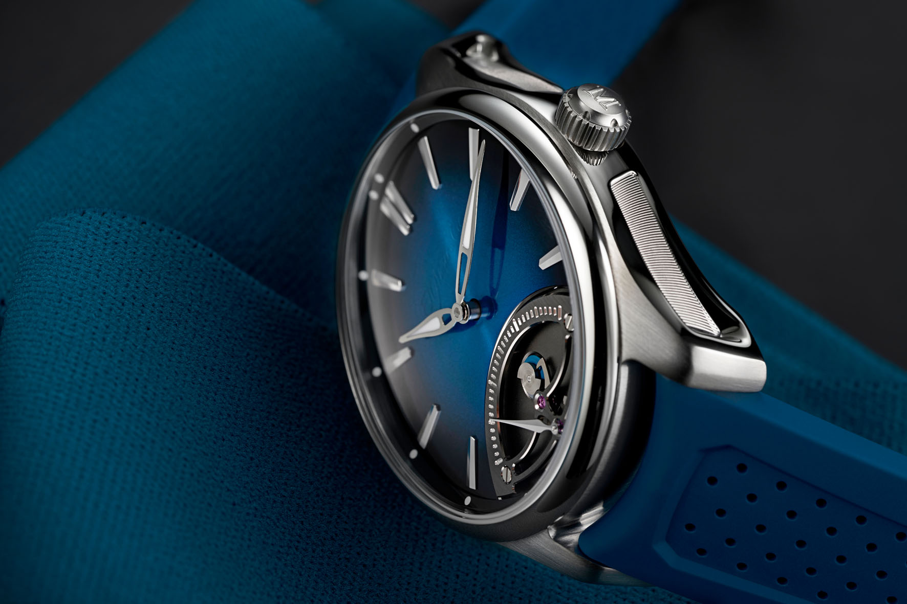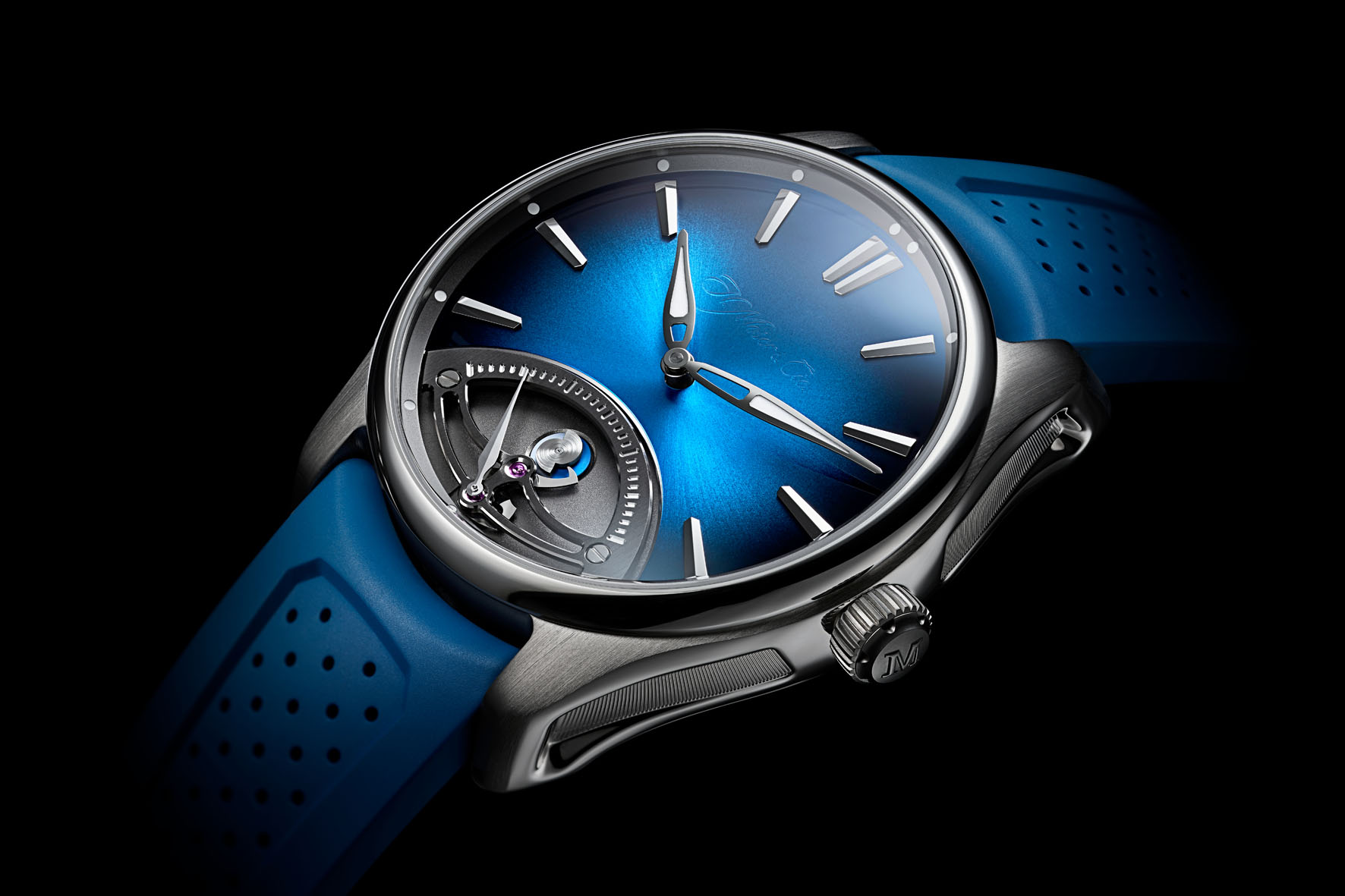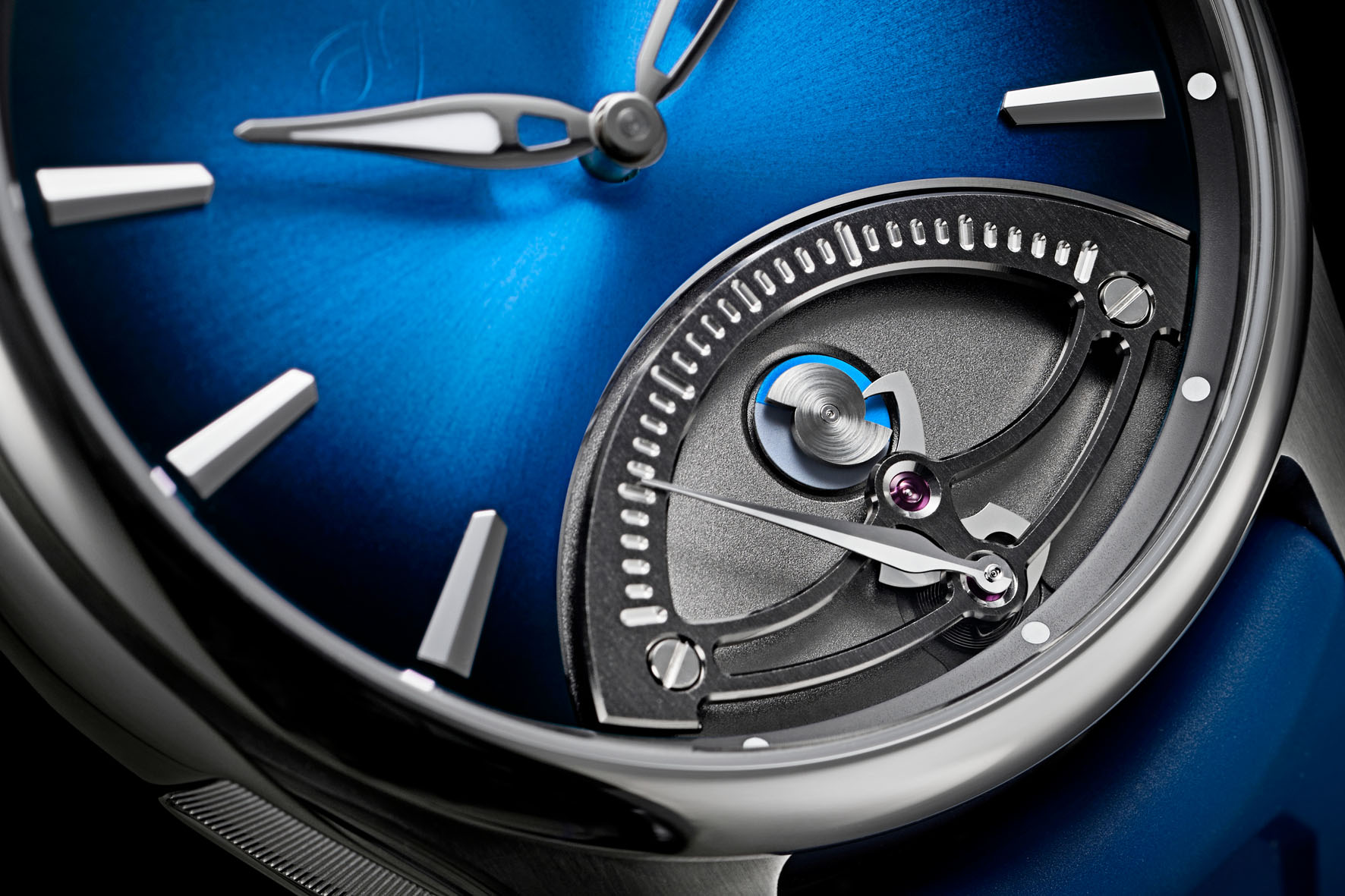 L’estetica del ponte scheletrato, stampato in argento, dei secondi retrogradi ricorda l’iconico ponte del tourbillon di H. Moser & Cie. Un disco bicolore sotto la chiocciola indica se l’orologio si trova nel primo o nel secondo periodo da 30 secondi del ciclo, aggiungendo un ulteriore tocco dinamico al fascino visivo dell’insieme.